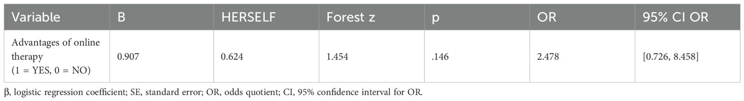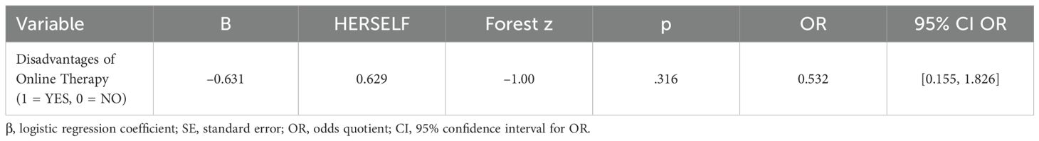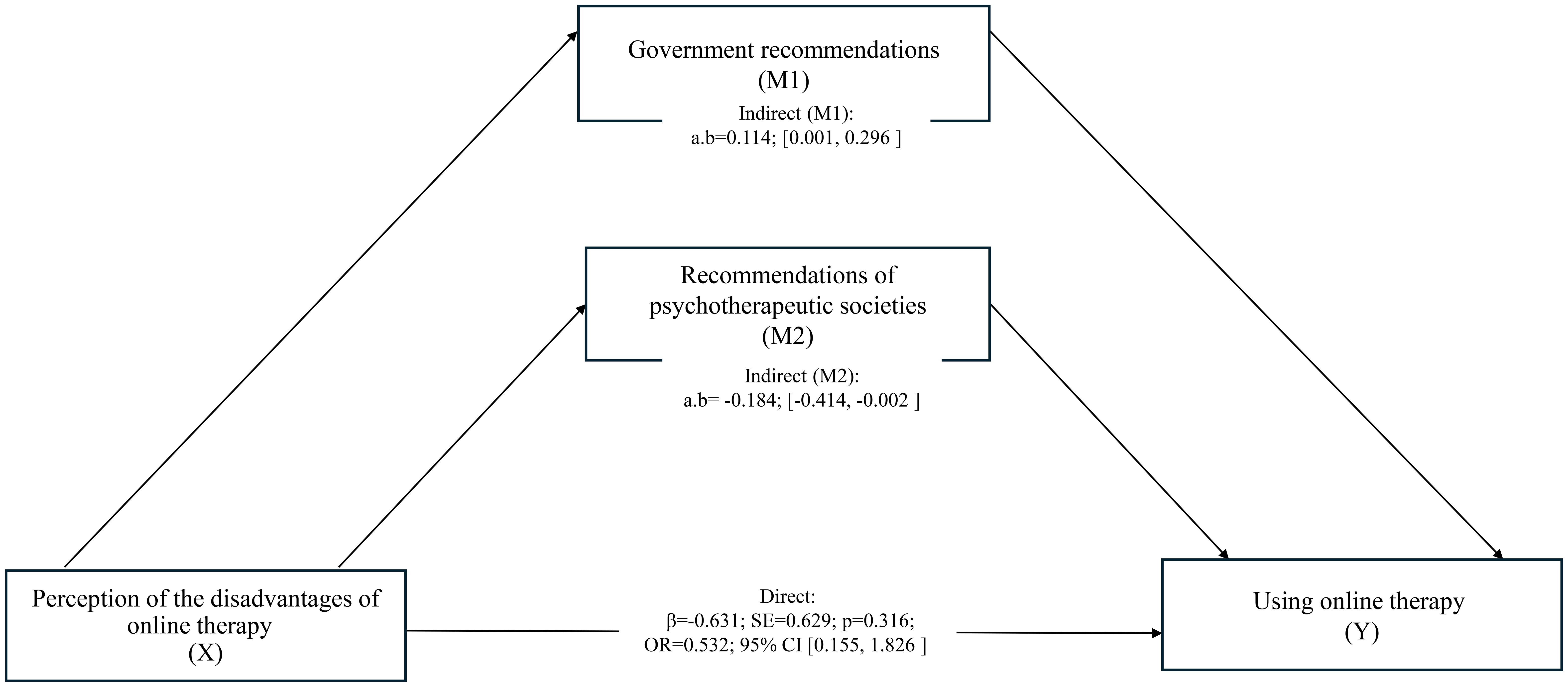 Since our goal was to examine direct and indirect relationships between variables—perceived advantages and disadvantages of online therapy, emotional factors, and the decision to use this form of therapy—we selected logistic and linear regression models and bootstrapping mediation analysis for statistical analyses. This is because regression models are a well-established method in psychological research for testing such relationships with observable variables and allow for direct interpretation of the strength and direction of effects. We also considered that the basic psychometric properties of the selected instruments (e.g., factor structure, validity, and reliability) had already been confirmed in validation studies.