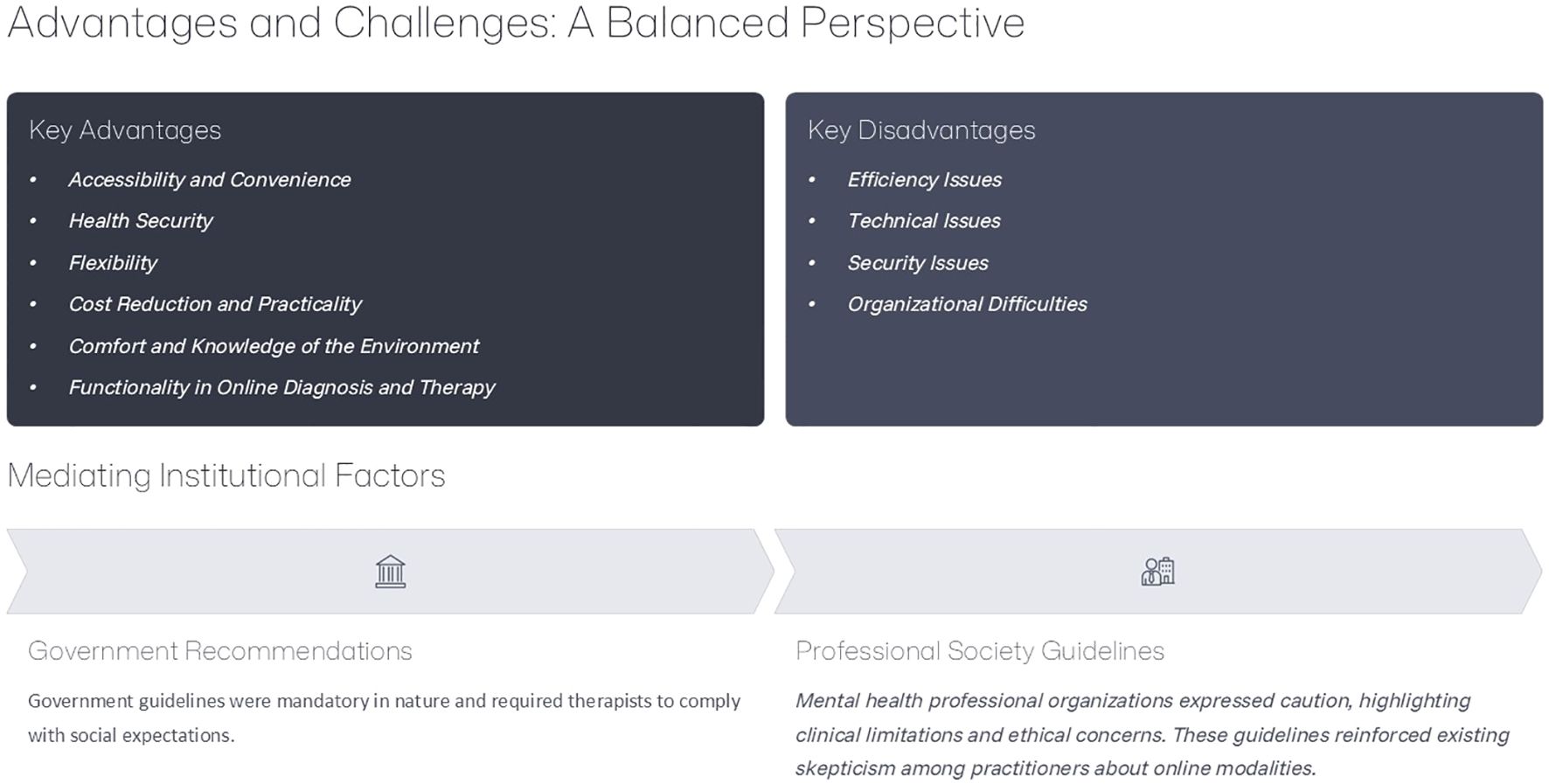 So far, few studies have directly compared these approaches in psychotherapists’ decisions to adopt online therapy. A review of the reveals a gap of knowledge: no comprehensive research has simultaneously (A) assessed how cognitive evaluations of the benefits and drawbacks of online therapy have influenced its adoption, (B) examined emotional (e.g., fear of infection, pandemic fatigue) and institutional (e.g., infection waves, trust in guidelines, health status) mediators of that influence, and (C) integrated qualitative insights from therapists with quantitative mediation analyses. Article fills this gap with a dedicated focus on the time period of the COVID-19 pandemic.