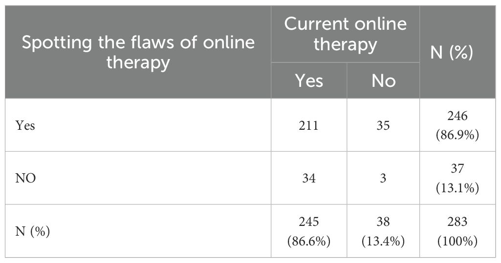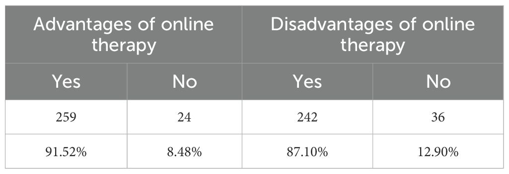 The results of the study on the perception of the advantages and disadvantages of online therapy are presented in Table 1. The vast majority of respondents reported both advantages (91.55%) and disadvantages (87.30%) of this form of work. This finding indicate that psychotherapists acknowledge both the benefits and limitations of online therapy.
