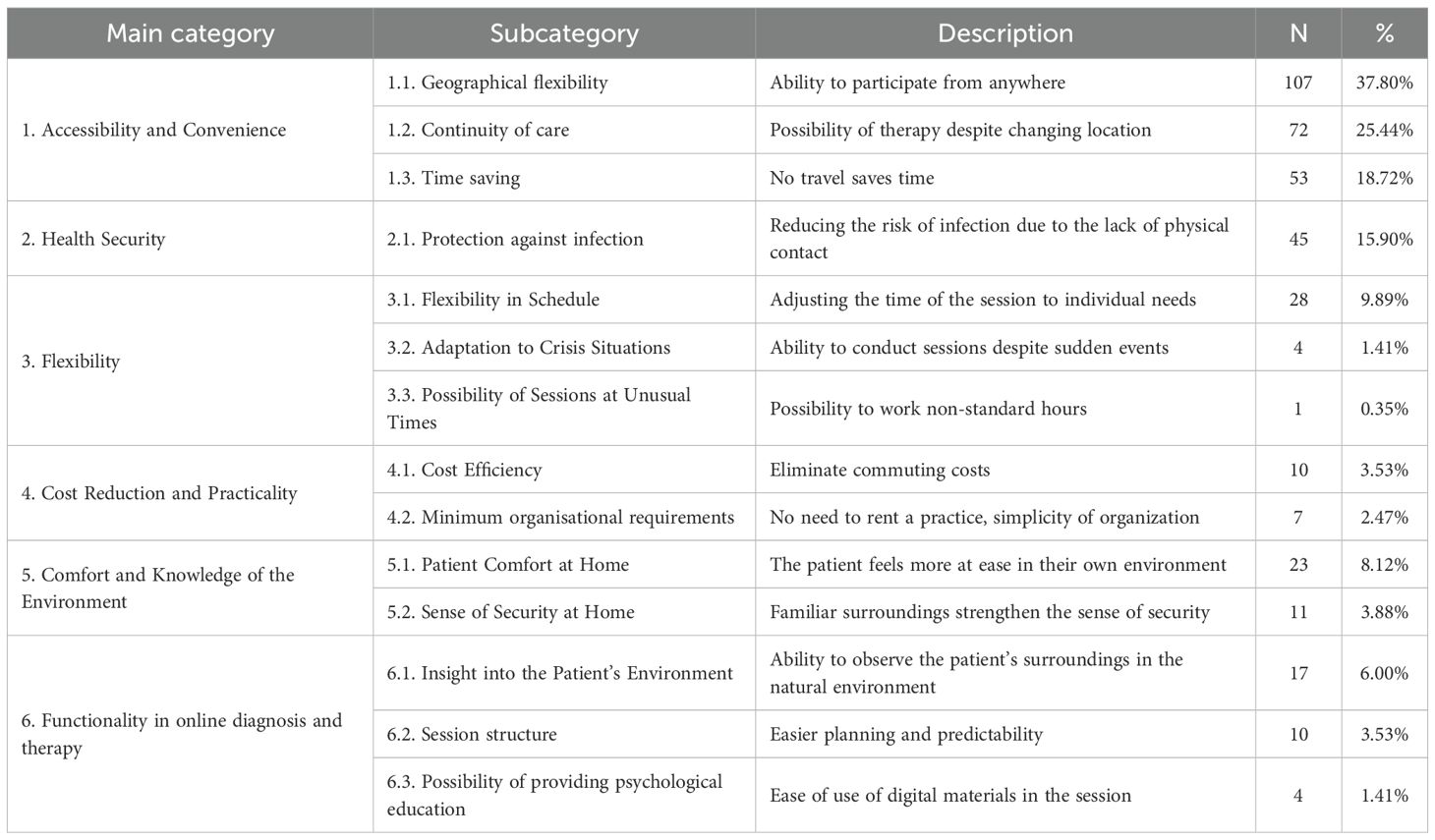 A qualitative analysis of the obtained data allowed for a description of the categories of advantages of online psychotherapy mentioned by psychotherapists. Table 2 presents the main categories, subcategories and examples of descriptions and frequency of perceiving a given advantage of online therapy, which were identified as part of the qualitative analysis based on the statements of psychotherapists.