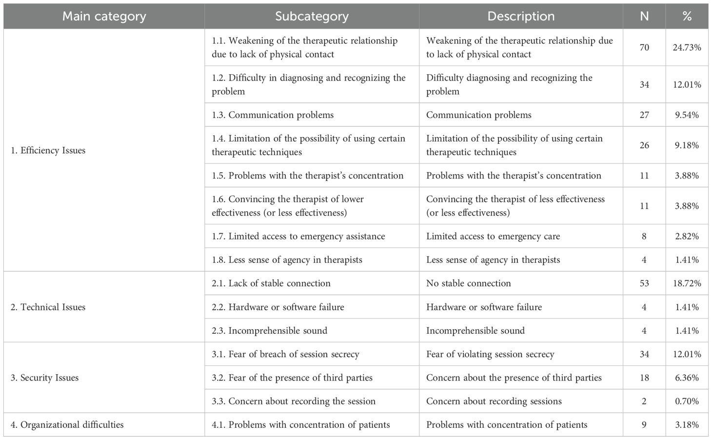 Online therapy, although it has many advantages, is also associated with a number of limitations and disadvantages noticed by psychotherapists. The areas they indicated were: technical problems, problems with the effectiveness of this form of therapy, organizational difficulties, and problems related to confidentiality and security (Table 3). It is worth noting that some of these difficulties were perceived as common to both sides of the therapeutic process, others as particularly troublesome for patients, and still others as specific challenges only for therapists.