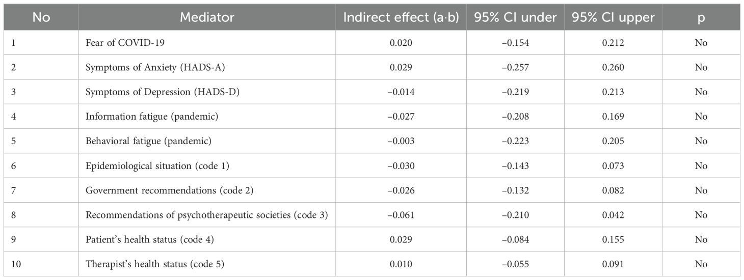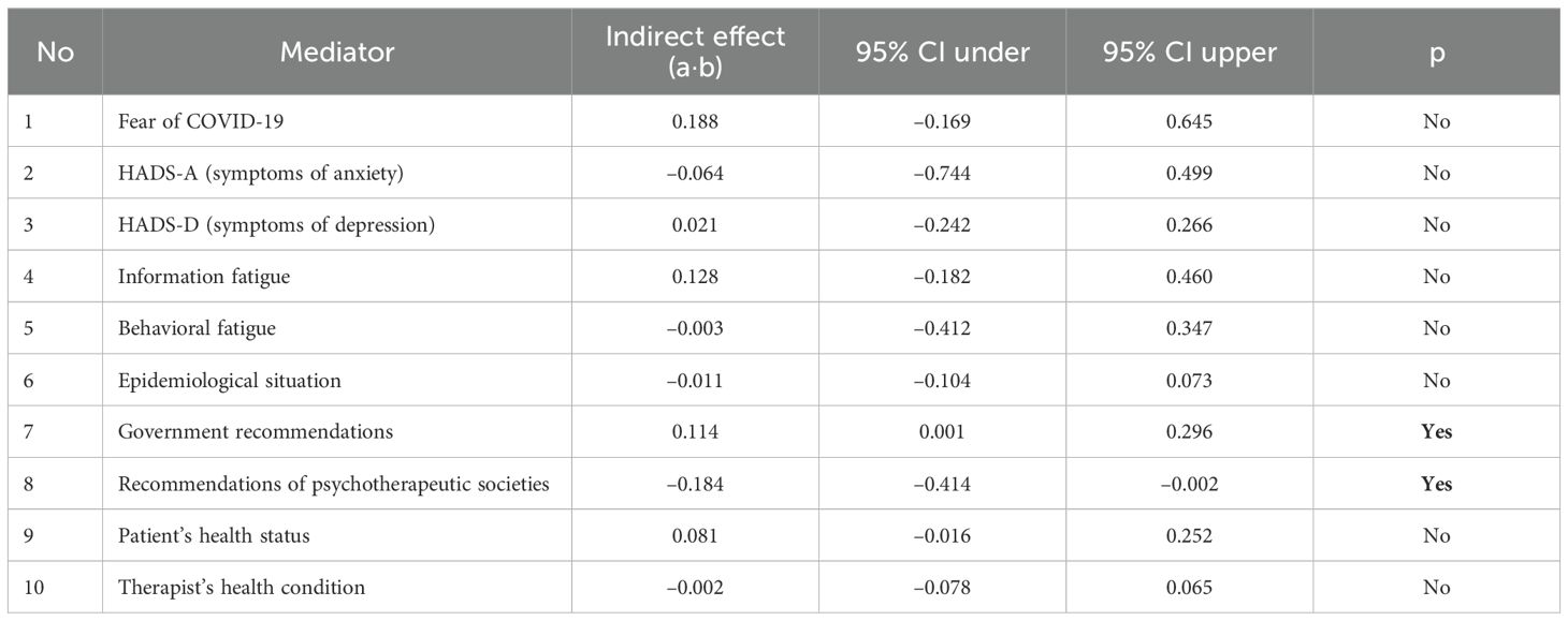 In the quantitative analysis, a set of statistical tests was conducted, such as tests of dependency, as well as predictive and mediation analyses. In the first step, chi-square independence tests were used to assess the relationship between dichotomous variables, i.e. perceiving the advantages or disadvantages of online therapy and the decision to conduct it (0 = no, 1 = yes). In the second step, logistic regression was used to investigate the predictive value of the perceived advantages and disadvantages of online therapy in relation to the decision to provide it. In addition, to increase the precision of interpretation, a set of univariate logistic regressions was also performed, in which the decision to use online therapy was predicted by individual advantages and disadvantages identified in the previous qualitative analysis. In order to investigate potential mediating effects, a mediation analysis using a bootstrapping procedure (2,000 resamples) was carried out as recommended by Hayes (37). We analyzed whether selected psychological variables (e.g. fear of COVID-19, symptoms of depression and anxiety, pandemic fatigue) and epidemiological and institutional variables (e.g. government or professional recommendations, health status of the therapist or patient) mediate the relationship between the perception of the advantages or disadvantages of online therapy and the decision to use it. Indirect effects (a·b) and their significance were assessed on the basis of 95% confidence intervals. An effect was considered significant if the confidence interval did not contain zero.