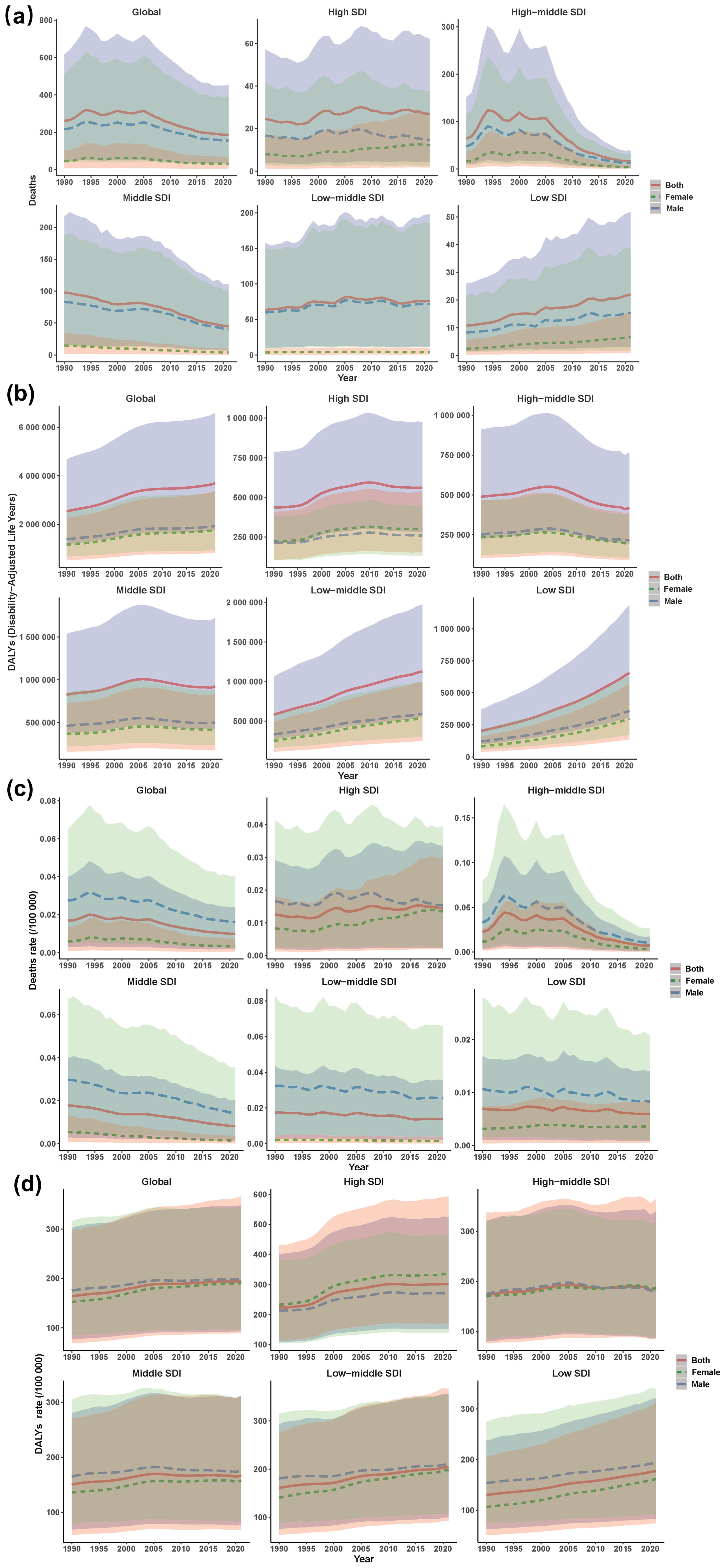 Between 1990 and 2021, mortality decreased by 27.6% among males and 31.5% among females, yet males consistently accounted for around five times more deaths than females in 2021. By contrast, DALYs increased in both sexes, with females exhibiting a notably greater relative increase (+51.4%, ASDR+25.2%) compared to males (+39.9%, ASDR+13.7%), a difference statistically significant (p<0.001). Analysis stratified by SDI indicated substantial decreases in deaths and DALYs within high-middle SDI regions, whereas low SDI regions demonstrated substantial increases in female deaths (+168.7%) and DALYs (+260.1%), highlighting profound gender disparities (Figures 1a, b, Supplementary Tables S1, S2).