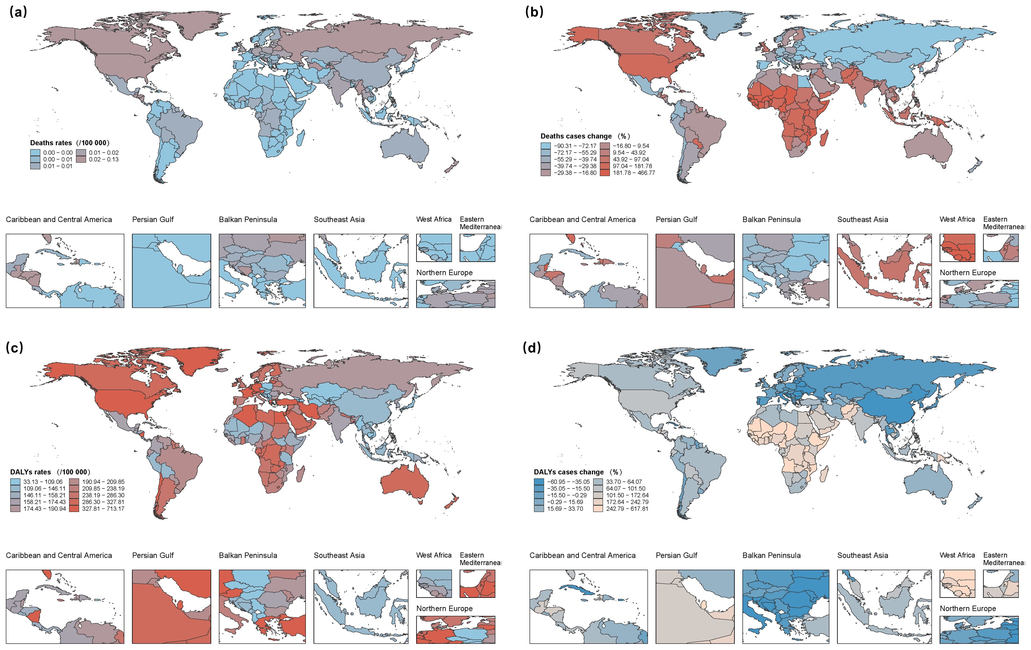 Figure 2. Global burden of childhood sexual abuse and bullying (CSA/B) among adolescents and young adults (10–24 years) across 204 countries and territories. (a) mortality rate in 2021. (b) Absolute change in the number of CSA/B-attributable deaths, 1990 to 2021. (c) DALY rate in 2021. (d) Absolute change in CSA/B-attributable DALYs, 1990 to 2021. DALY, disability-adjusted life year; CSA/B, childhood sexual abuse and bullying.