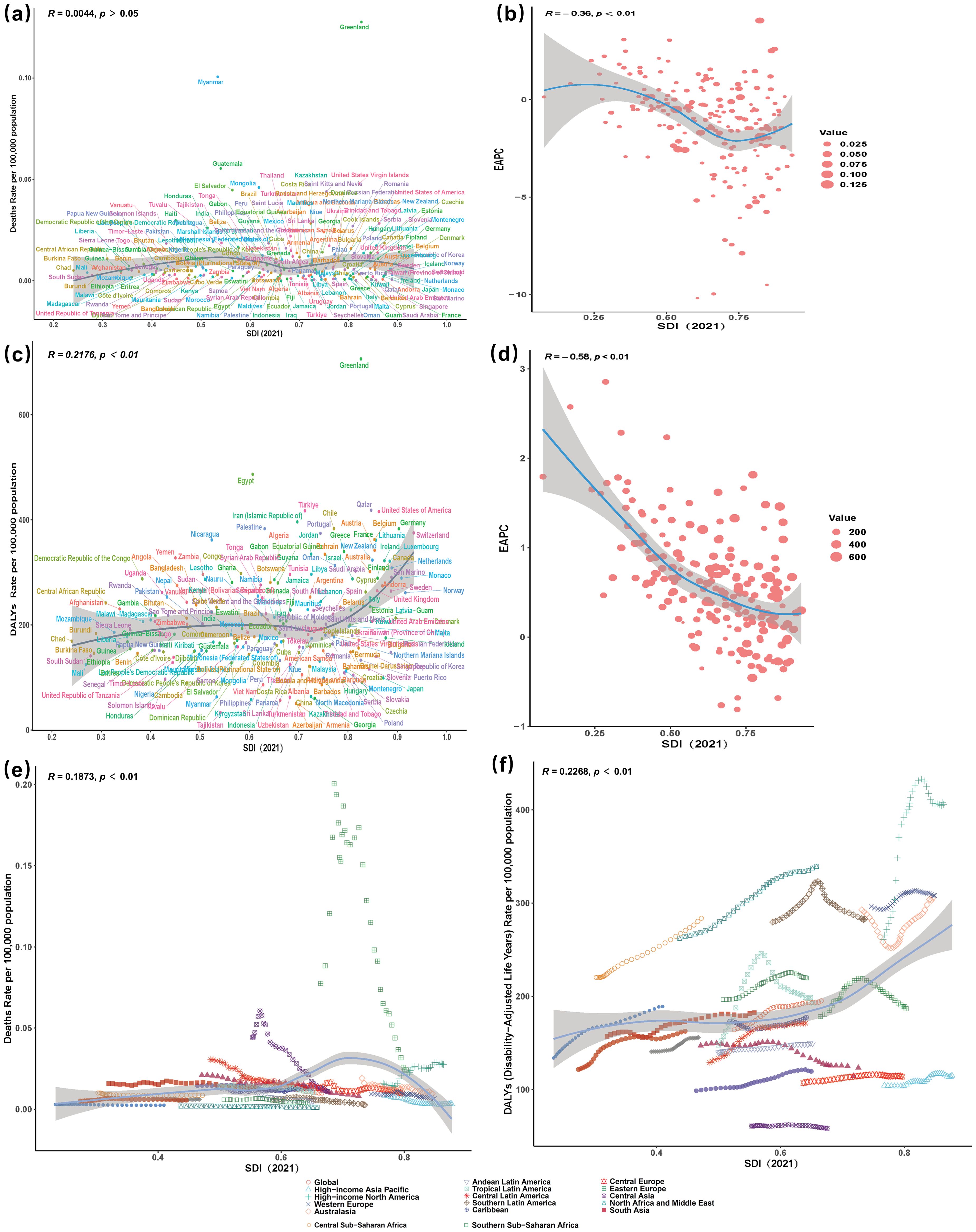 Figure 3. Correlations between CSA/B-related mortality and DALY rates and SDI/EAPC. (a, c) Associations in 2021 between SDI and mortality rate (a) or DALY rate (c). (b, d) Associations in 1990–2021 between SDI and the EAPC of mortality rate (b) or the EAPC of DALY rate (d). (e, f) SDI–mortality and SDI–DALY trajectories across 21 GBD regions, 1990–2021; points from left to right denote successive years and the solid line shows the expected value. CSA/B, childhood sexual abuse and bullying; SDI, sociodemographic index; DALY, disability-adjusted life year; EAPC, estimated annual percentage change.