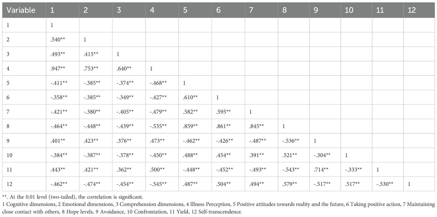According to the study results, the mean score for illness perception, hope levels, confrontation, avoidance, yield and self-transcendence were 42.79 ± 9.30, 34.10 ± 9.21, 24.50 ± 9.51, 20.69 ± 6.30, 14.70 ± 4.61 and 44.08 ± 10.38, respectively. Pearson’s correlation analysis showed that self-transcendence was positively associated with hope levels (r = 0.538, P < 0.01) and confrontation (r = 0.516, P < 0.01) but negatively associated with illness perception (r = -0.537, P < 0.01), avoidance (r = -0.503, P < 0.01), and yield (r = -0.489, P < 0.01); hope levels was positively associated with confrontation (r = 0.481, P < 0.01) yet negatively associated with illness perception (r = -0.579, P < 0.01), avoidance (r = -0.391, P < 0.01), and yield (r = -0.388, P < 0.01); illness perception was negatively associated with confrontation (r = -0.457, P < 0.01) but positively associated with avoidance (r = 0.479, P < 0.01) and yield (r = 0.498, P < 0.01). (All detailed in Table 2).