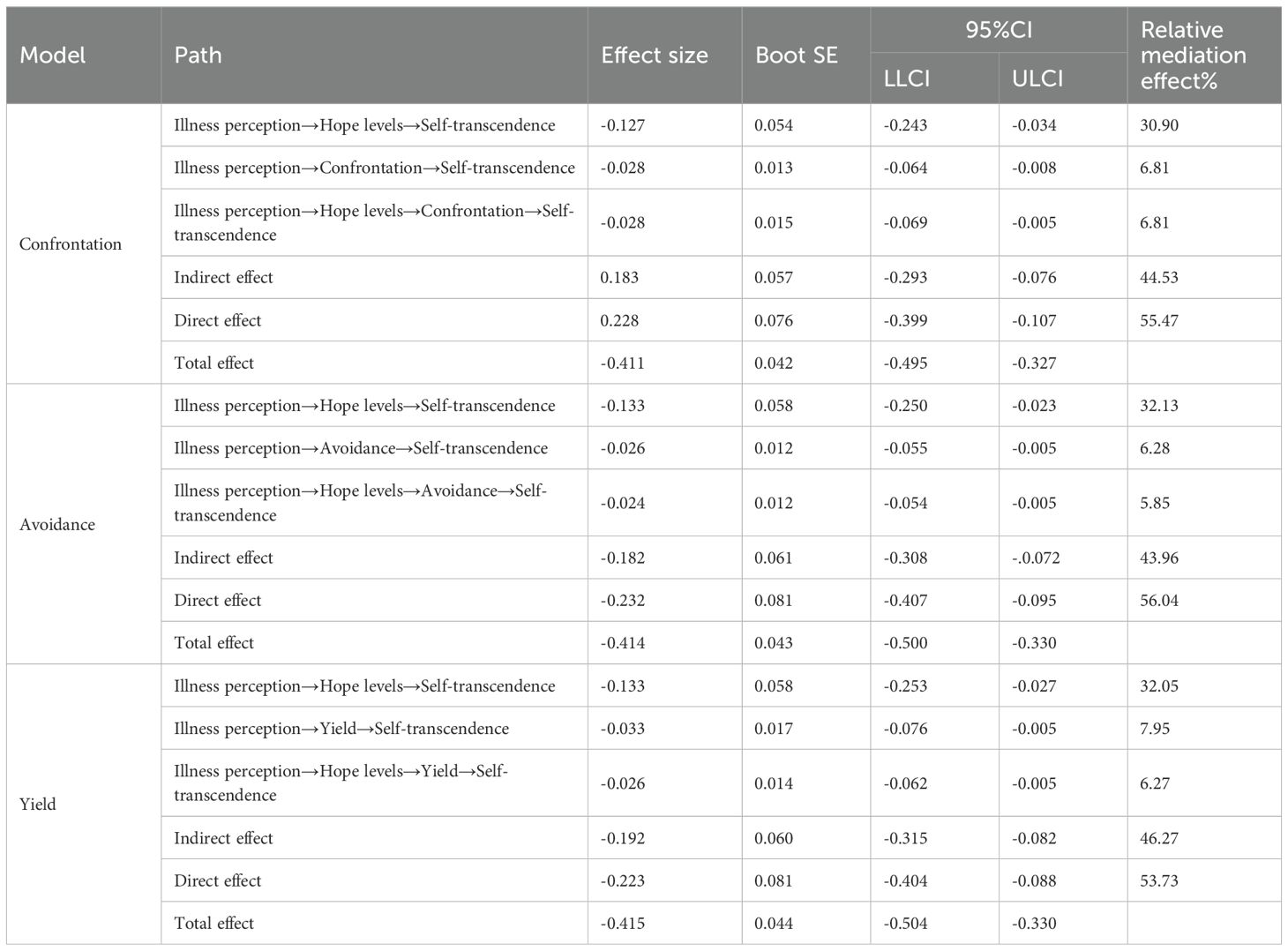 As detailed in Table 3, Bootstrap analyses revealed significant partial mediation effects (all 95% confidence intervals excluded 0). For Model 1, the direct effect accounted for 55.47% of the total effect, while total indirect effects represented 44.53%, with the chained mediation of hope levels and confrontation dimensions contributing 6.81%. In Model 2, the direct effect accounted for 56.04% of the total effect, total indirect effects 43.96%, and hope levels and avoidance dimensions chained mediation contributed to 5.85%. Model 3 showed a direct effect proportion of 53.73%, total indirect effects 46.27%, and hope levels and yield dimensions chained mediation 6.27%. These findings confirm that hope levels combined with confrontation, avoidance, and yield dimensions partially mediate the relationship between illness perception and self-transcendence. The structural pathways are illustrated in Tables 3.