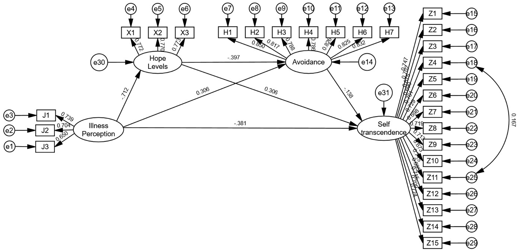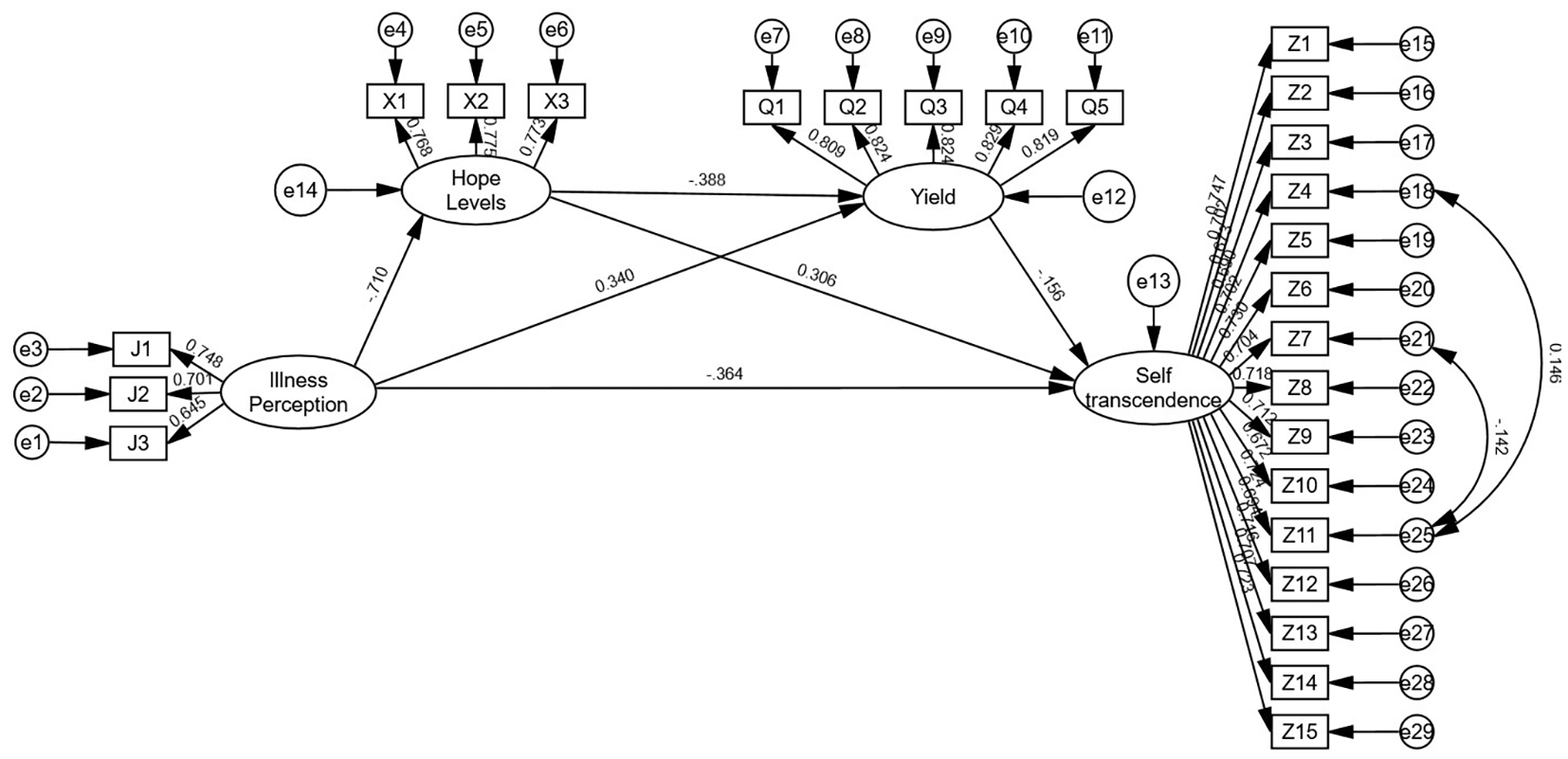 The mean scores for illness perception, hope levels, confrontation, avoidance, yield and self-transcendence were 42.79 ± 9.30, 34.10 ± 9.21, 24.50 ± 9.51, 20.69 ± 6.30, 14.70 ± 4.61 and 44.08 ± 10.38, respectively. The importance ranking of the random forest model was: illness perception, avoidance, confrontation, hope levels, self-rated health status and yield. The mediation model analysis indicated that illness perception had a significant direct effect on self-transcendence (confrontation, avoidance, and yield dimensions: 55.47%, 56.04%, 53.73%), the independent mediating effect of hope levels (30.90%, 32.13%, 32.05%), the independent mediating effect of coping styles (6.81%, 6.28%, 7.95%), and the chain mediating effect of hope levels and coping styles (6.81%, 5.85%, 6.27%).