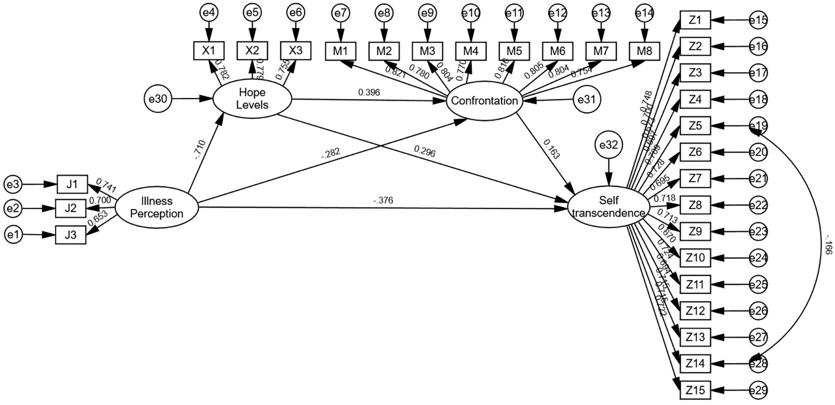 Gastric cancer is a prevalent and life-threatening disease globally and represents one of the leading causes of cancer-related mortality in the word. According to the latest data released by the International Agency for Research on Cancer (IARC) (1), gastric cancer accounted for over 968,000 new cases and approximately 660,000 deaths globally in 2022, ranking as the fifth most common cancer and a leading cause of cancer-related mortality worldwide. The disease usually be discovered at an advanced stage, resulting in a significant disease burden and survival challenges (2). Moreover, gastric cancer patients undergoing chemotherapy frequently encounter considerable psychosocial challenges, including anxiety and depression. Research has indicated that gastrointestinal problems interact with psychological disorders such as depression through the microbiota-gut-brain axis mechanism (MGBA) (3). These issues not only impact patient adherence to therapy but are also intricately linked to quality of life (4). The NCCN emphasizes the importance of integrating mental health support into cancer management, listing psychological distress as the “sixth vital sign” (5). Consequently, examining the psychological adjustment mechanisms of gastric cancer patients, particularly identifying the factors that promote their positive psychological state and spiritual development, holds significant theoretical and practical significance. This study is founded on the stress-coping model (6), which highlights that when people encounter stressful situations, they first evaluate the stressors’ nature and importance cognitively, then produce emotional reactions and coping strategies, and ultimately affect their psychological and physical well-being. In gastric cancer patients undergoing chemotherapy, illness perception as the core of cognitive assessment, reflects patients’ comprehension of the illness, emotional experiences, and its consequences (7). Positive illness perception facilitates patients’ acceptance of their situation and fosters an optimistic outlook (7), whereas negative illness perception can engender frustration and helplessness, diminish hope, and prompt the adoption of maladaptive coping strategies (8). Hope, as a positive psychological resource, can enhance patients’ confidence and motivation in confronting their condition, facilitating their psychological recovery and adaptability (8). Coping strategies represent the specific behavioral strategies employed by patients and serve as a crucial link in the transition from cognition to mental health (9). Additionally, self-transcendence as a notion of psychological growth and spiritual elevation, underscores persons surpassing their limitations in the face of adversity to enhance their inner spiritual strength and sense of well-being (10). It performs as a crucial psychological resource for cancer patients to adapt to their illness and improve their quality of life (11). Previous studies indicates that self-transcendence levels exhibit a substantial negative correlation with patients’ illness perception (12) and a large positive correlation with hope levels (13). Nevertheless, these studies have predominantly concentrated on the impacts of singular psychological variables, failing to systematically integrate the underlying mechanisms among variables, particularly within the gastric cancer patient demographic, where there is an absence of chain-mediated research that encompasses cognitive, emotional, behavioral, and spiritual variables. Therefore, this study attempts to integrate illness perception (cognitive dimension), hope levels (emotional dimension), coping strategies (behavioral dimension), and self-transcendence (spiritual dimension) into an integrated theoretical framework, constructing a chain-mediated model to systematically investigate the mechanisms of psychological adaptation in gastric cancer patients undergoing chemotherapy. This study posits the following hypothesis based on the stress-coping model: Hypothesis 1: The level of illness perception in gastric cancer patients affects their degree of hope, consequently facilitating the attainment of self-transcendence. Positive cognition enhances patients’ confidence and optimistic expectations, thereby stimulating their level of hope and facilitating advanced psychological progress. Hypothesis 2: Illness perception indirectly influences self-transcendence by affecting patients’ coping strategies. Individuals with elevated cognitive levels are more inclined to adopt positive coping strategies, hence enhancing psychological adaption and self-transcendence; Hypothesis 3: Hope levels and coping strategies play a chain-mediated role in the process between illness perception and self-transcendence. Hope levels enhance patients’ coping resources and capabilities, fostering the implementation of positive coping strategies and ultimately facilitating self-transcendence. This study innovatively constructs a multi-level chain mediation model based on the stress-coping model to conduct an integrated analysis of illness perception, hope levels, coping strategies, and self-transcendence in gastric cancer patients undergoing chemotherapy. This not only enriches the theoretical framework of psychological adaptation in cancer patients but also provides scientific evidence for clinical nursing and psychological intervention, thereby enhancing the mental health and quality of life of cancer patients.