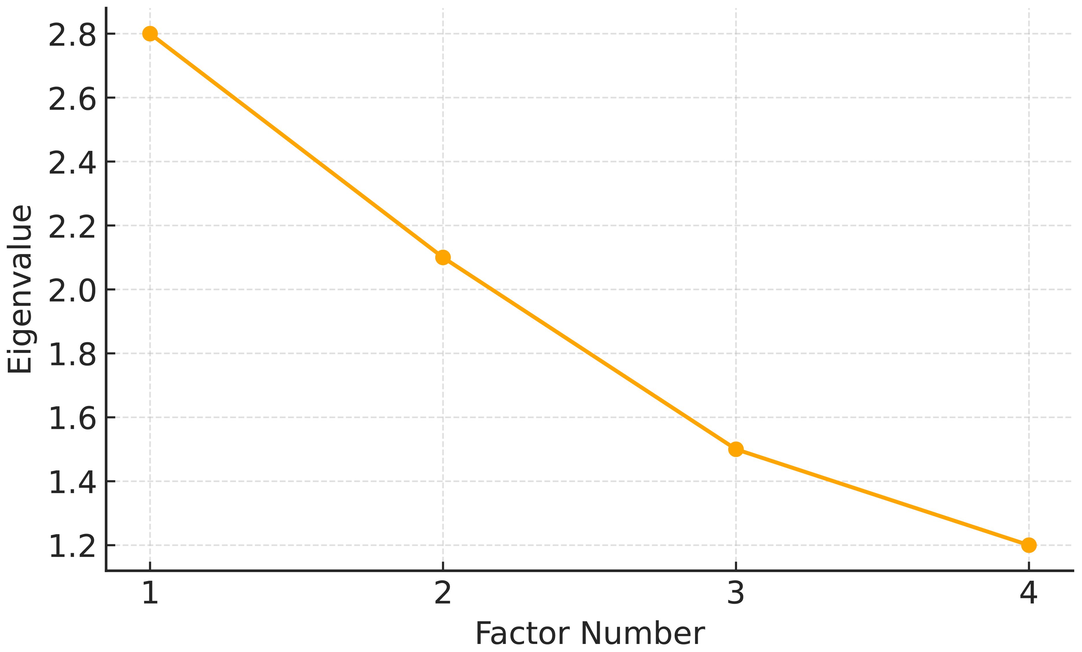 EFA using maximum likelihood estimation was performed on the 22-lecture module ratings (N = 426) to identify the latent content domains. Four factors were extracted, as illustrated in Figure 1, which presents a scree plot supporting the four-factor solution.
