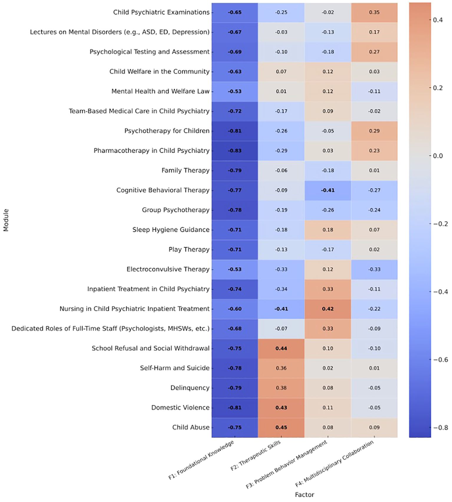 Four factors were extracted: foundational knowledge (F1), therapeutic skills (F2), problem behavior management (F3), and multidisciplinary collaboration (F4), based on eigenvalues > 1.0 and scree plot inspection. The module loadings for each factor are shown in Figure 2, which is a heatmap of the factor loadings across the 22 modules.
