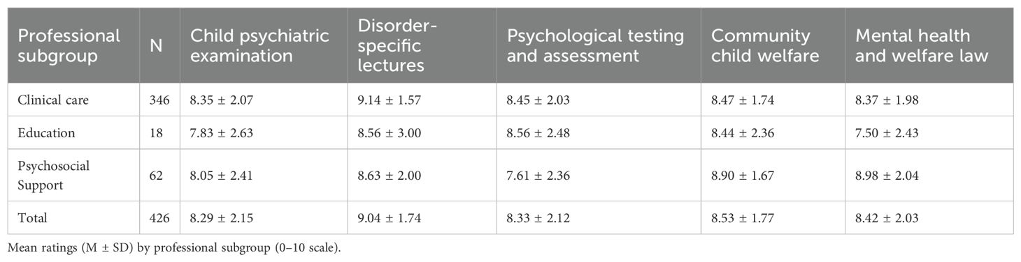 This study offers a data-driven foundation for designing a competency- and evidence-based training curriculum for child and adolescent psychiatry. By prioritizing practical therapeutic training, structured interprofessional collaborative exercises, and domain-tailored content, the proposed curriculum can better equip Japan’s multidisciplinary workforce to address the escalating needs of youth mental health care.