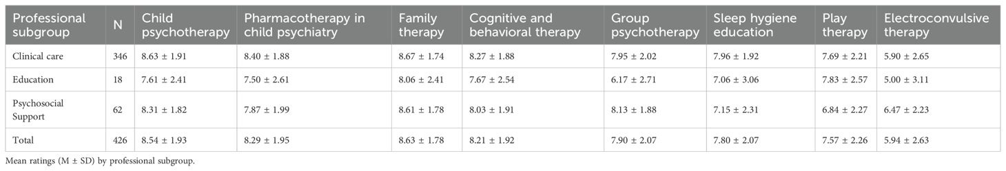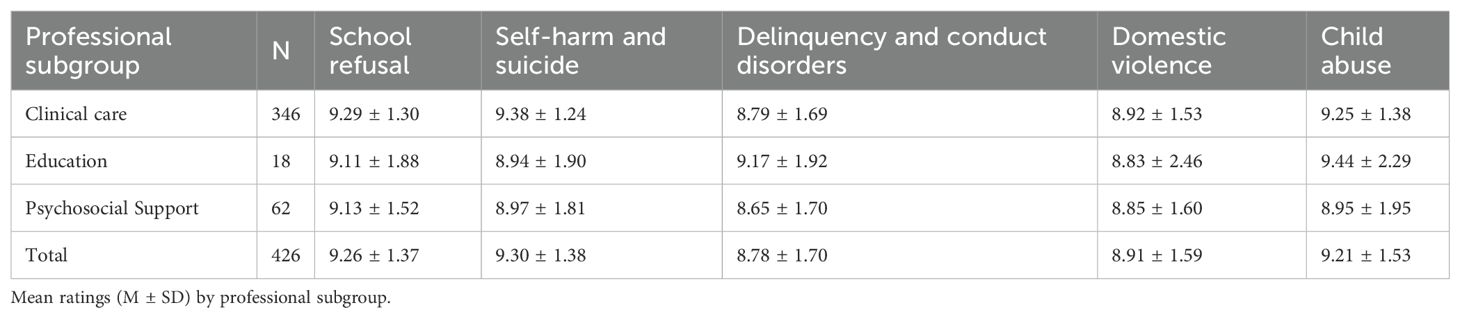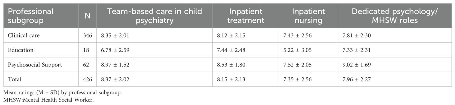 This three-group classification was based on prior research and global policy frameworks that recognize that multidisciplinary teams in child and adolescent mental health commonly operate within three core functional domains: clinical care, education, and psychosocial support (2, 19). This function-based grouping improved interpretability and reflected real-world collaboration patterns among professionals. Such domain-based categorization improves the interpretability of subgroup analyses, especially when sample sizes within each original profession are limited.