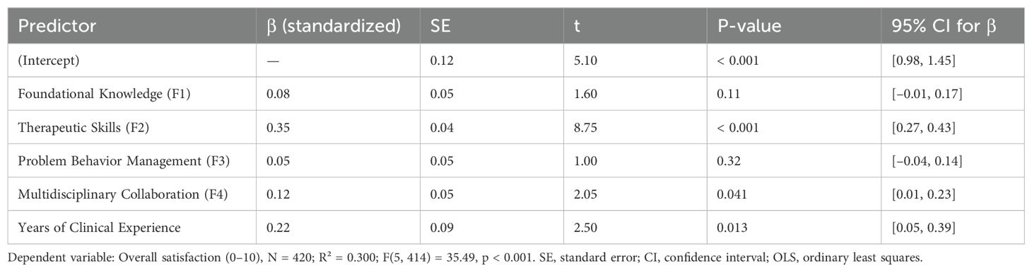 To identify the training domains and participant characteristics that most strongly influenced overall satisfaction, we fitted an OLS regression model using the 0–10 satisfaction rating as the dependent variable. The independent variables were factor scores from the four identified content domains: foundational knowledge (F1), therapeutic skills (F2), problem behavior management (F3), and multidisciplinary collaboration (F4); and years of clinical experience. Analysis was conducted using a subset of 420 respondents with complete data. Estimated coefficients with 95% confidence intervals are reported in Table 4.