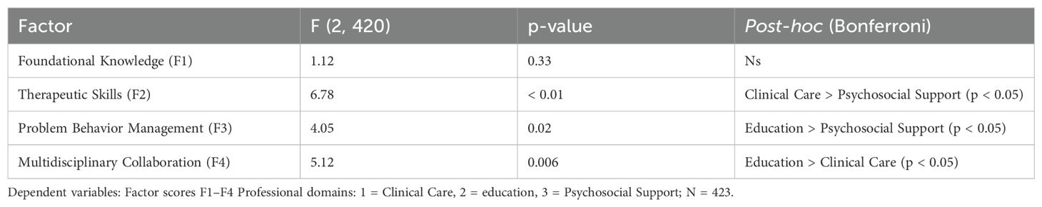 A one-way analysis of variance (ANOVA) with Bonferroni-corrected post hoc tests was conducted to compare factor scores across the three professional subgroups: clinical care, educational professionals, and psychosocial support.