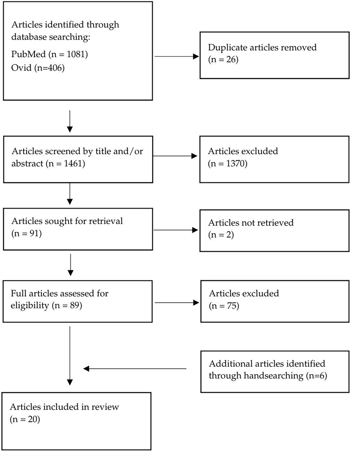 The process of study selection is outlined in the flow-chart (Figure 1). The electronic database search was conducted by one author (C.M.) in July 2024. The database search identified 1487 articles. The citations were exported to RefWorks and 26 duplicate articles were removed. The abstracts of 1461 articles were reviewed, and 1370 articles were excluded for not meeting the inclusion criteria. Two articles were unable to be retrieved. The remaining 89 articles were assessed for eligibility by reviewing the full texts. Fourteen articles met the inclusion and exclusion criteria after full-text review. The main reasons for study exclusion were not having PTSD as an outcome measure (n=46) and the population including more than just inpatient psychiatric staff (n=26). Six additional records were identified through handsearching the references of the eligible articles and included in the review.