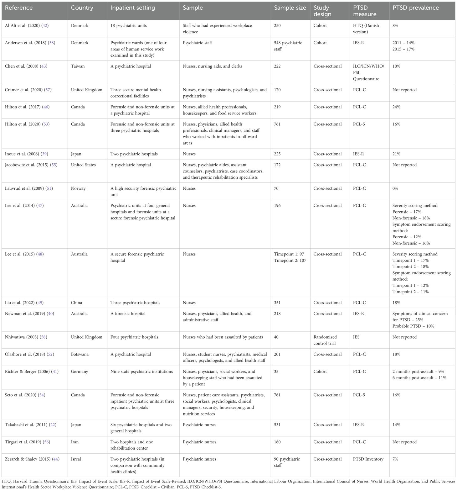The characteristics of the 20 articles included in this review are presented in Table 1. Included studies were published between 2003 and 2022. Studies were conducted in a variety of locations including Canada, USA, UK, Denmark, Norway, Switzerland, Germany, Botswana, Iran, Israel, Japan, China, and Australia. There was significant variation in sample size, with sample sizes ranging from 35 to 2678. Eleven studies included multiple types of healthcare workers, including nurses, patient care assistants, psychiatrists, social workers, psychologists, clinical managers, security, housekeeping, and nutrition services. Nine studies included only mental health nurses. Most of the studies were cross-sectional (n=16, 80%), three were prospective cohort studies (15%), and one was a randomized control trial (5%).