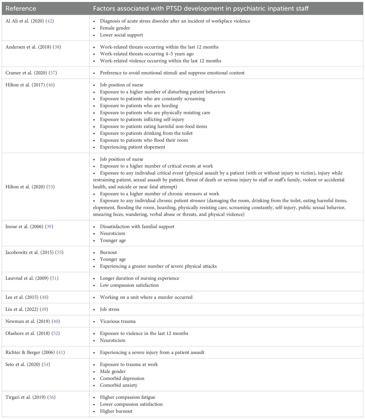 There were mixed results on the association between gender and PTSD, with one study reporting that female healthcare workers on psychiatric units are more likely to meet criteria for a diagnosis of PTSD (42), one study reporting that male healthcare workers on psychiatric units are more likely to screen positive for PTSD (54), and three studies finding no correlation between gender and PTSD (39, 44, 53). One study found that older mental healthcare workers reported more PTSD symptoms (56), while two studies found that younger staff were more likely to screen positive for PTSD (39, 55). Marital status was not found to be associated with PTSD (39, 44).