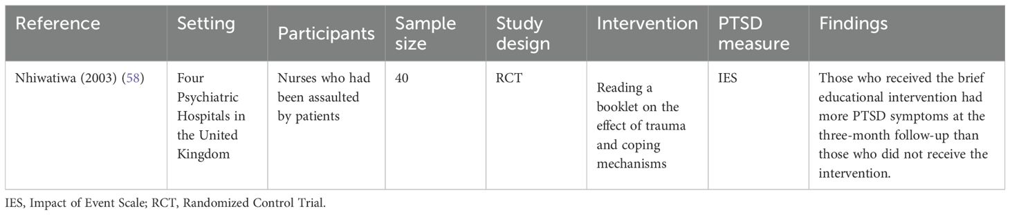 Only one interventional study met inclusion and exclusion criteria for this review, as shown in Table 3. Nhiwatiwa et al. (2003) found that the brief educational intervention of reading a booklet on the effect of trauma and coping in the direct aftermath of a patient assault was associated with greater PTSD symptoms in nurses who had been assaulted (58).