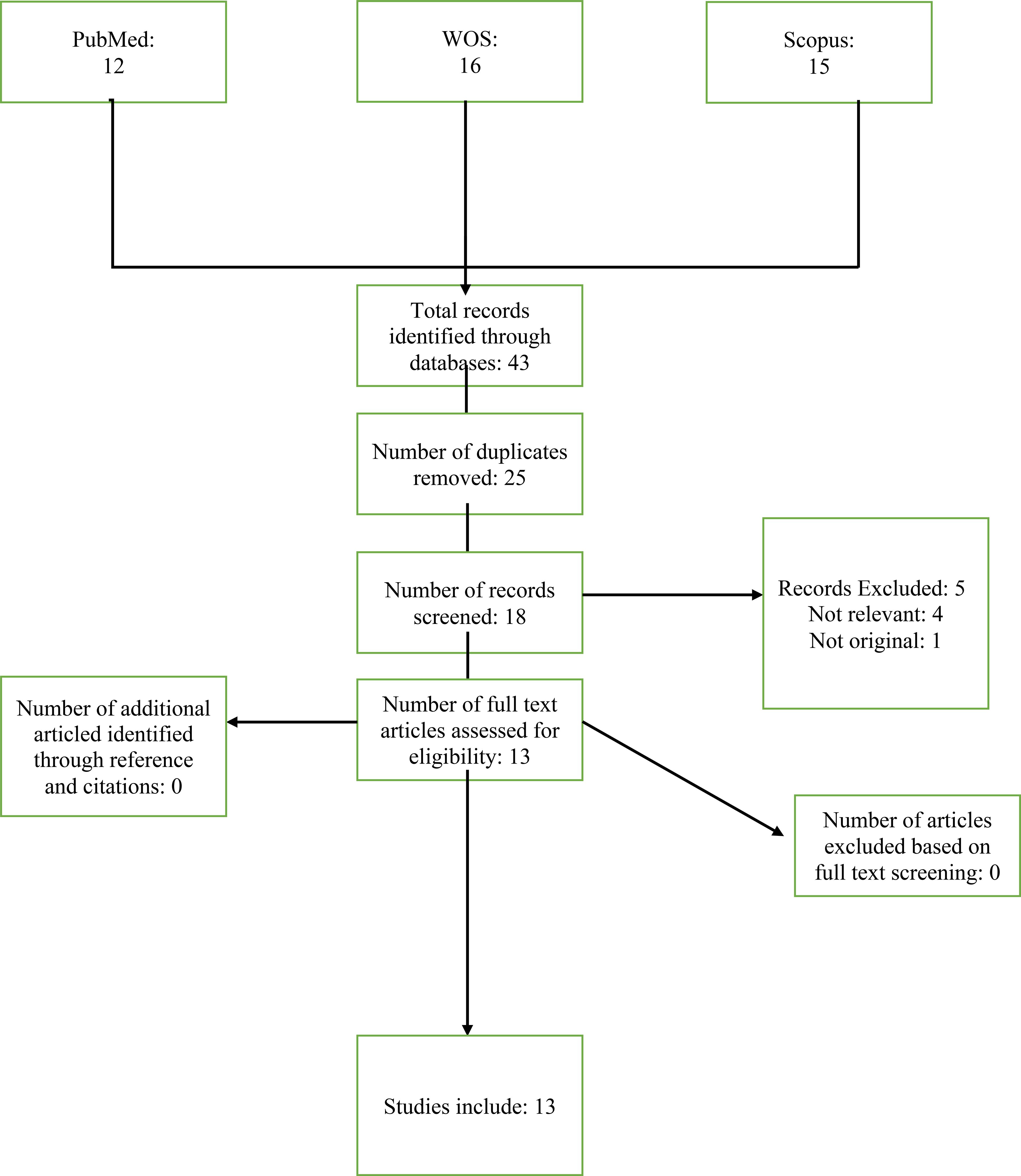 Our search strategy yielded 43 studies (Figure 1). After removing duplicates (n=25) and screening the titles, abstracts, and full-text articles, 13 studies met the eligibility criteria of this systematic scoping review (10, 14, 24–34). Full details of excluded studies, including titles, authors, and reasons for exclusion, are provided in the Supplementary Table 1.