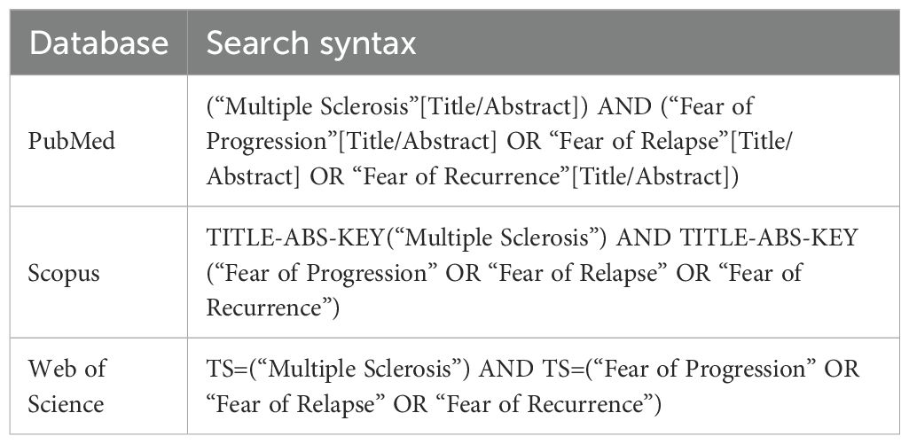 We conducted a systematic search across three major databases—PubMed, Web of Science, and Scopus from inception through October 6, 2024. The search strategy was designed to capture studies focusing on fear of progression or relapse among patients with MS. The keywords used to conduct this search were: (Multiple Sclerosis) AND (“Fear of Progression” OR “Fear of Relapse” OR “Fear of Recurrence”). The search syntax for each database is provided in Table 1.