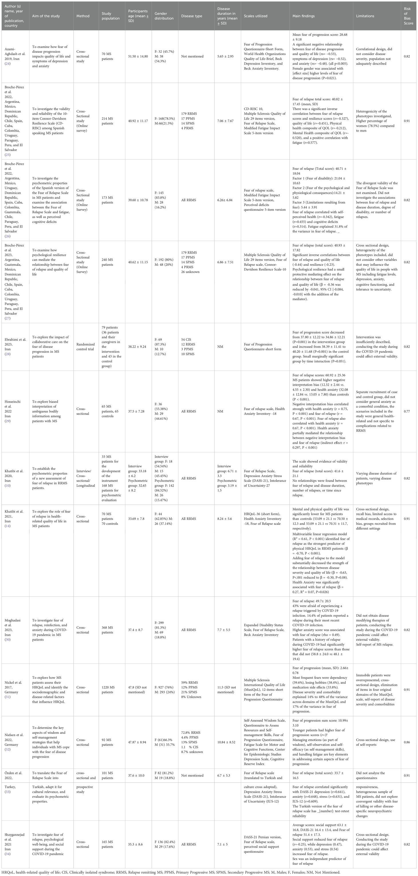 The included studies were mostly conducted in Iran, Turkey, Germany, and Spanish-speaking countries, which limits the generalizability of findings to other regions with different cultural perceptions of illness and different health care systems. Two different assessment tools were used (Fear of Relapse Scale and Fear of Progression Questionnaire) with some differences in their focus and scope. Substantial heterogeneity in MS types (e.g., RRMS, PPMS, SPMS), disease durations, and severity levels further complicates synthesis of the evidence. Most studies employed cross-sectional designs, precluding causal inferences. While these studies provide valuable insights into associations between fear of relapse or disease progression and psychological or clinical outcomes, they do not allow for conclusions about causality or temporal sequence. As a result, it remains unclear whether fear contributes to increased anxiety, fatigue, and reduced quality of life, or whether these factors, in turn, exacerbate fear.
