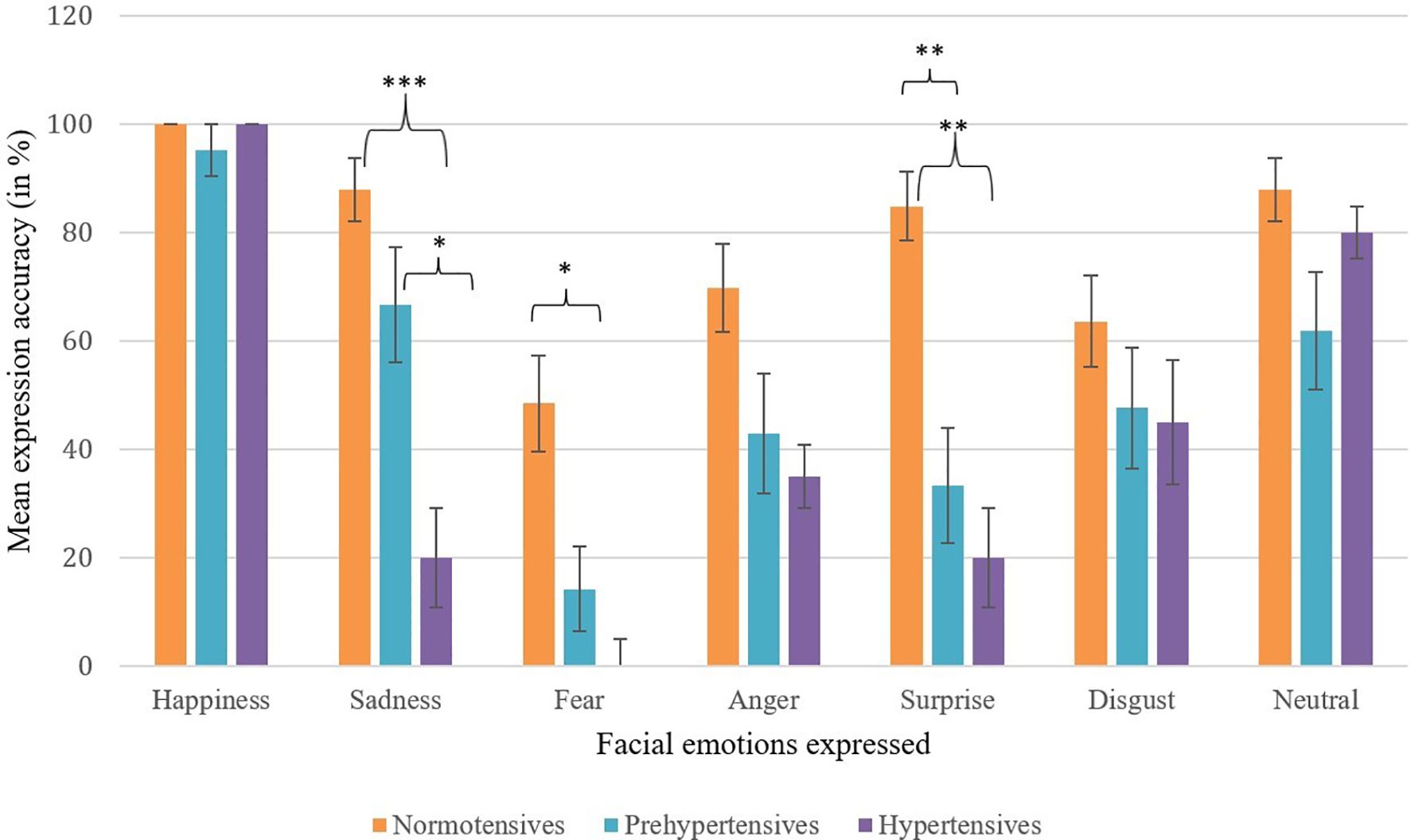 Figure 1. Mean expression accuracy across facial emotions by blood pressure group. Error bars represent ±1 SE. Selective dampening is evident for sadness, fear, and surprise among prehypertensive and hypertensive groups. Asterisks indicate statistically significant between-group differences (*p <.05, **p <.01, ***p <.001).