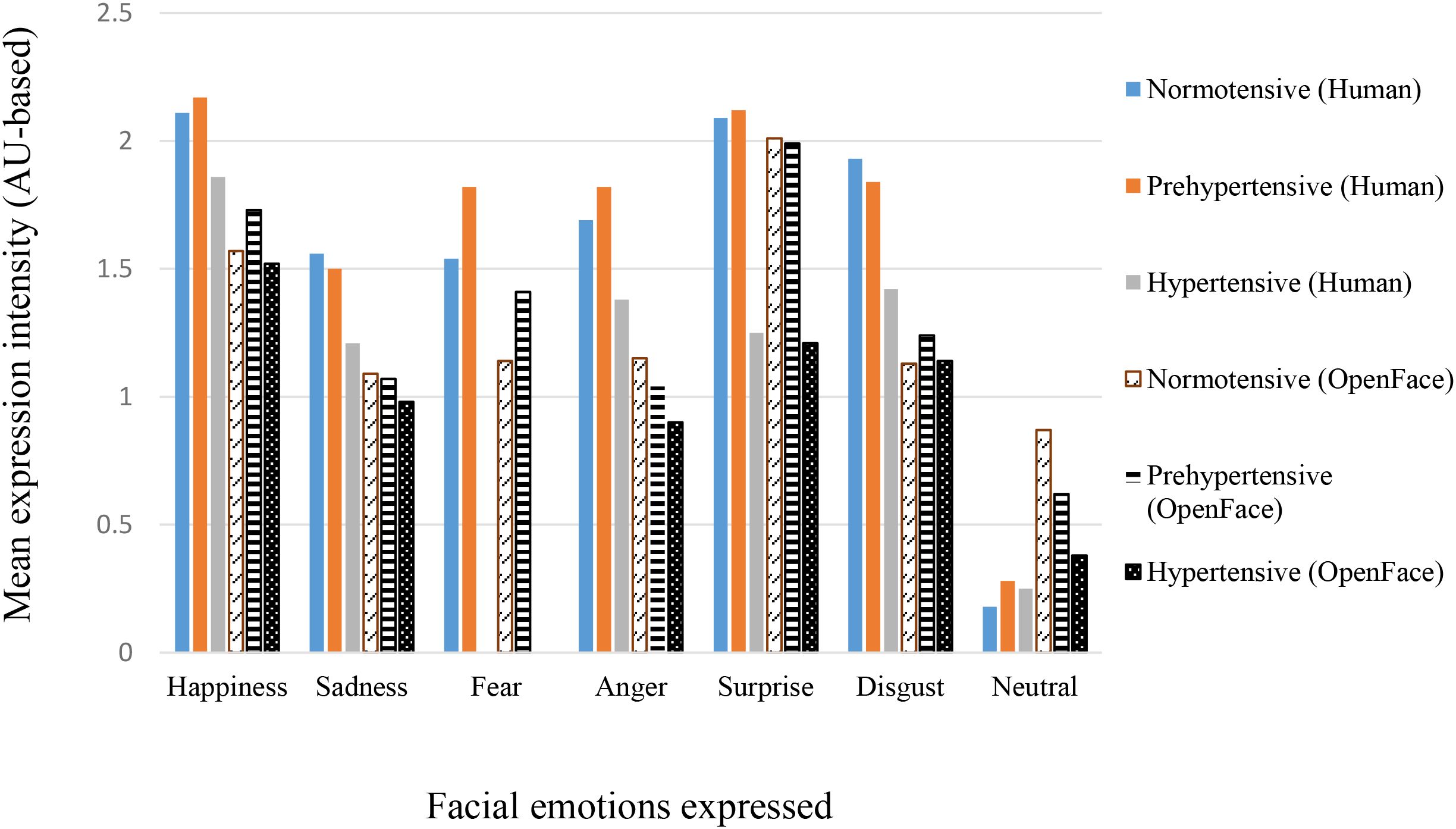 Figure 2. Mean expression intensity across blood pressure groups for Human and OpenFace codings. Values represent group means (see Table 4 for SDs).