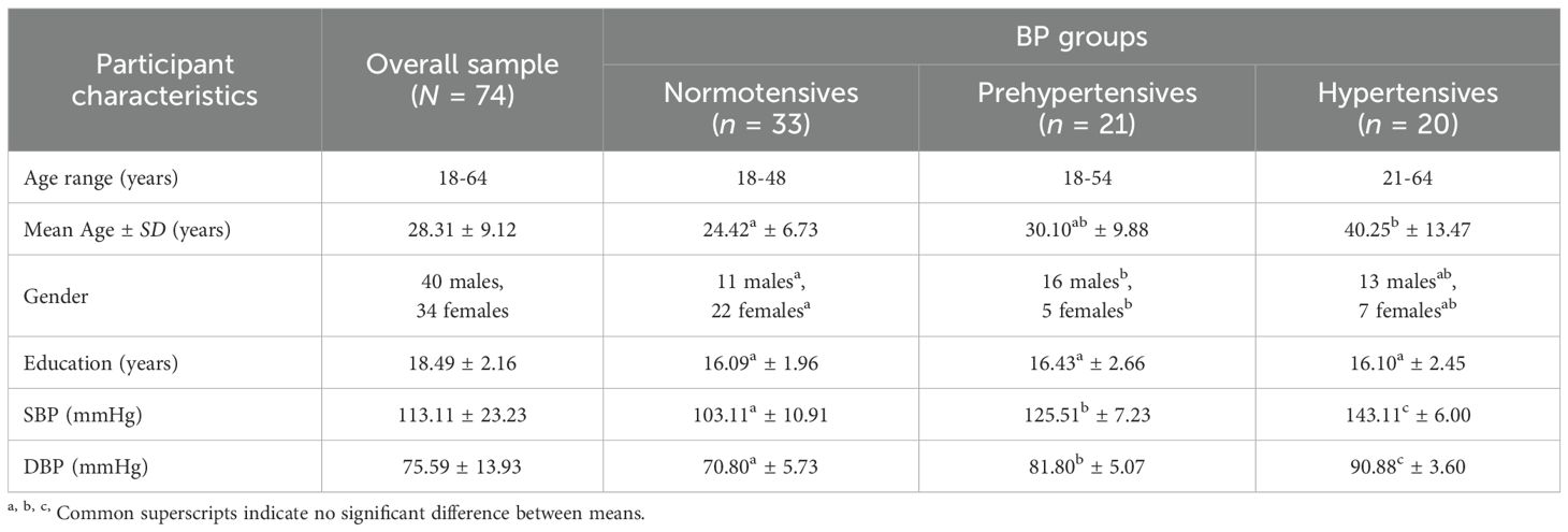 As evident from Table 1, there were significant differences in the mean ages of the three BP groups, F(2, 71) = 16.176, p <.001, such that hypertensives were significantly older than the normotensives (p <.001) as well as the prehypertensives (p = .004). Normotensives did not differ significantly from prehypertensives in terms of mean age (p = .127). There were also significant differences in the gender composition of the three BP groups, χ2(2, N = 74) = 10.813, p = .004. Normotensives had significantly lower number of males and significantly higher number of females than the prehypertensives. Additionally, there was no significant difference in the means of education (in years), F(2, 71) = 0.158, p = .854, across all the three BP groups. By design, SBP and DBP differences were significant across BP groups, F(2, 71) = 132.92, p <.001; F(2, 71) = 101.86, p <.001, respectively. The hypertensives had the highest means, for both SBP and DBP, followed by that of the prehypertensives, and that of the normotensives, as expected.