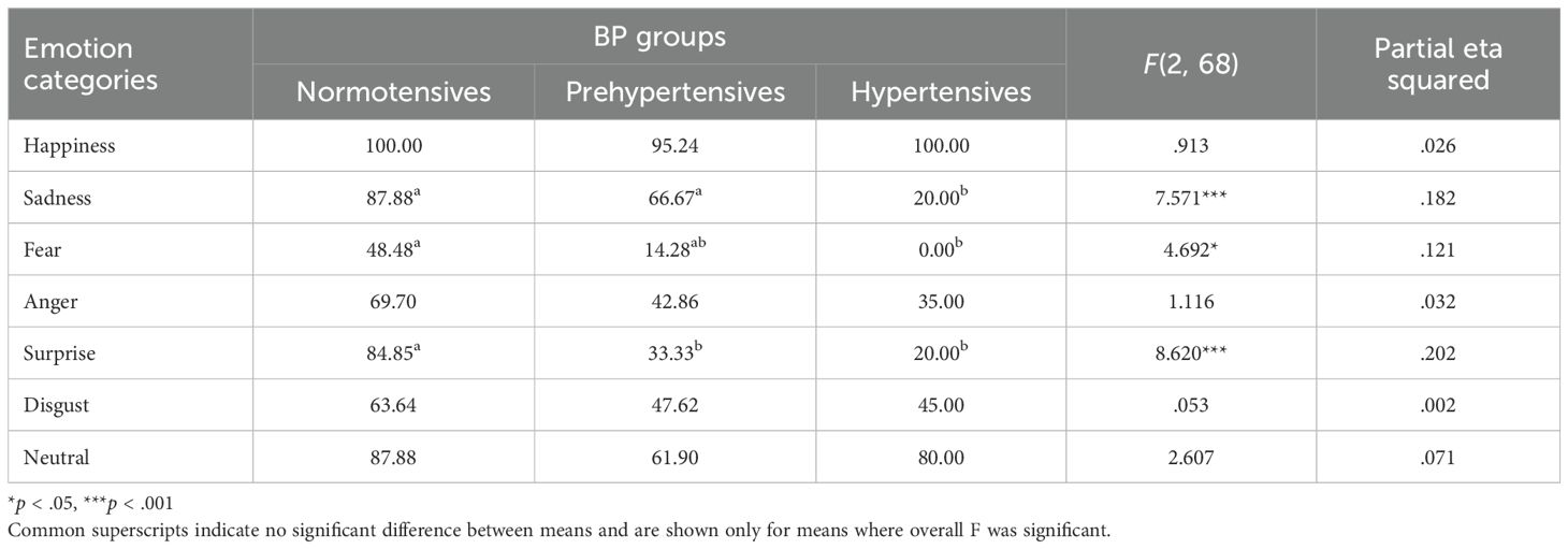 Table 2. Mean accuracy of emotional expression (in percentages) across different BP groups and emotion categories, along with F and effect size.