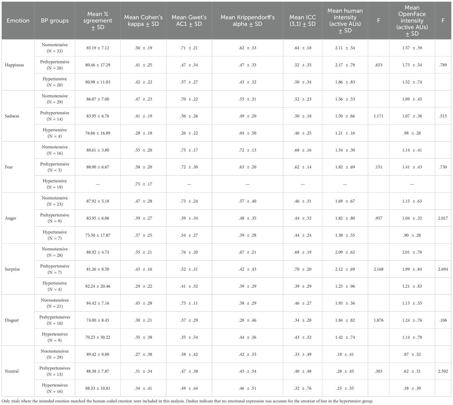 Table 3 summarizes the mean percent agreement, inter-rater reliability statistics, and expression intensity scores (Human and OpenFace) for correctly expressed trials across the six basic emotions and neutral, separately for the three BP groups (see also Figure 2 for expression intensity scores). Across emotions, mean percent agreement between human and OpenFace codings was generally high (70.23–89.42%), with the highest values observed for Surprise and Neutral in the normotensive group, and the lowest for Disgust in the hypertensive group. However, agreement statistics varied notably across emotion categories and groups.