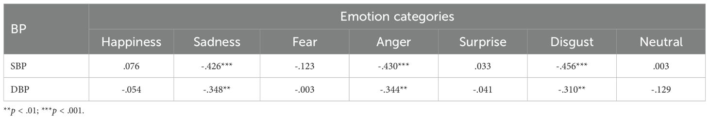 Next, partial correlations of SBP and DBP with the accuracy of emotional expressions revealed significant negative correlations of both SBP with DBP with the accuracy of expressing sadness, anger, and disgust (see Table 4), indicating that with increase in either SBP or DBP, the facial expressions of sadness, anger, and disgust, prominent negative emotions (with the exception of fear), deteriorates.