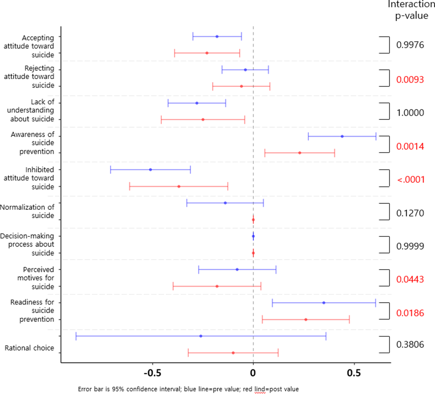 Figure 2. Pre-Post Evaluation of Attitudes Toward Suicide in the Online and Face-to-Face Gatekeeper Training Groups. Pre- (blue) and post-intervention (red) means with 95% confidence intervals are shown for each attitude subdomain. The x-axis indicates the change direction and magnitude. Interaction p-values reflect group x time effects (ANCOVA, adjusted for baseline). Significant between-group differences were observed in rejecting attitude, awareness, inhibited attitude, perceived motives, and readiness for prevention. See Table 3 for detailed statistics.