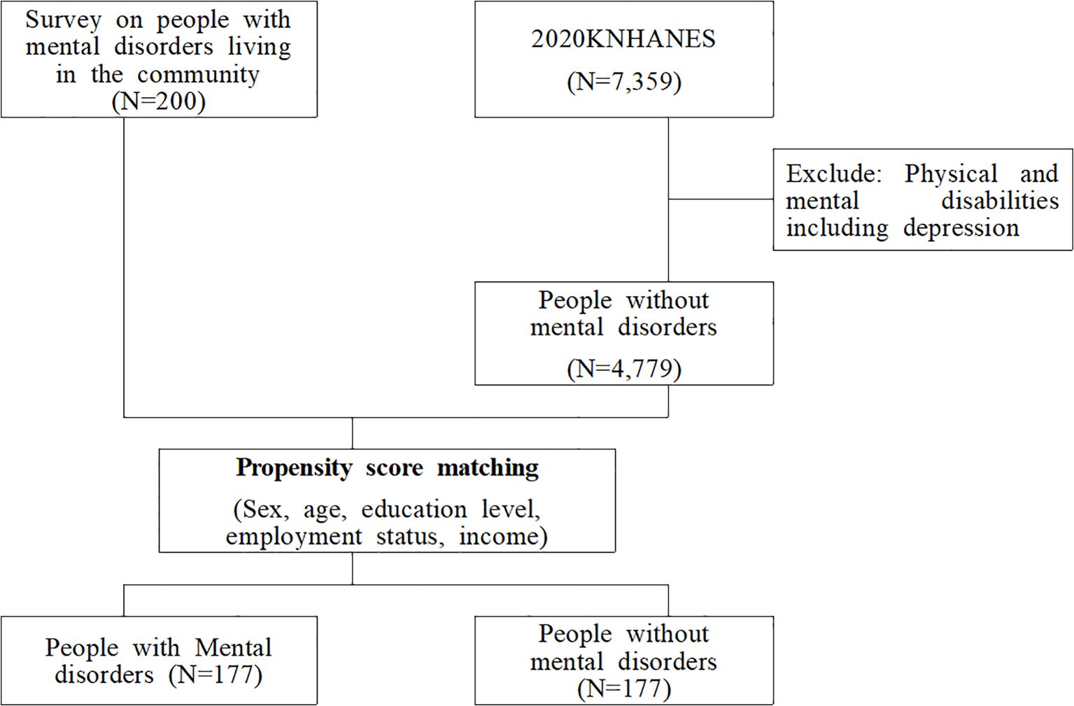 Flowchart showing participant selection. From a community mental disorders survey (N=200) and 2020 KNHANES (N=7,359), persons with disabilities includingdepression are excluded. This results in 4,779 people without mental disorders. The groups undergo propensity score matching based on sex, age, education, employment status, and income. Final matched groups: People with mental disorders (N=177) and people without mental disorders (N=177).