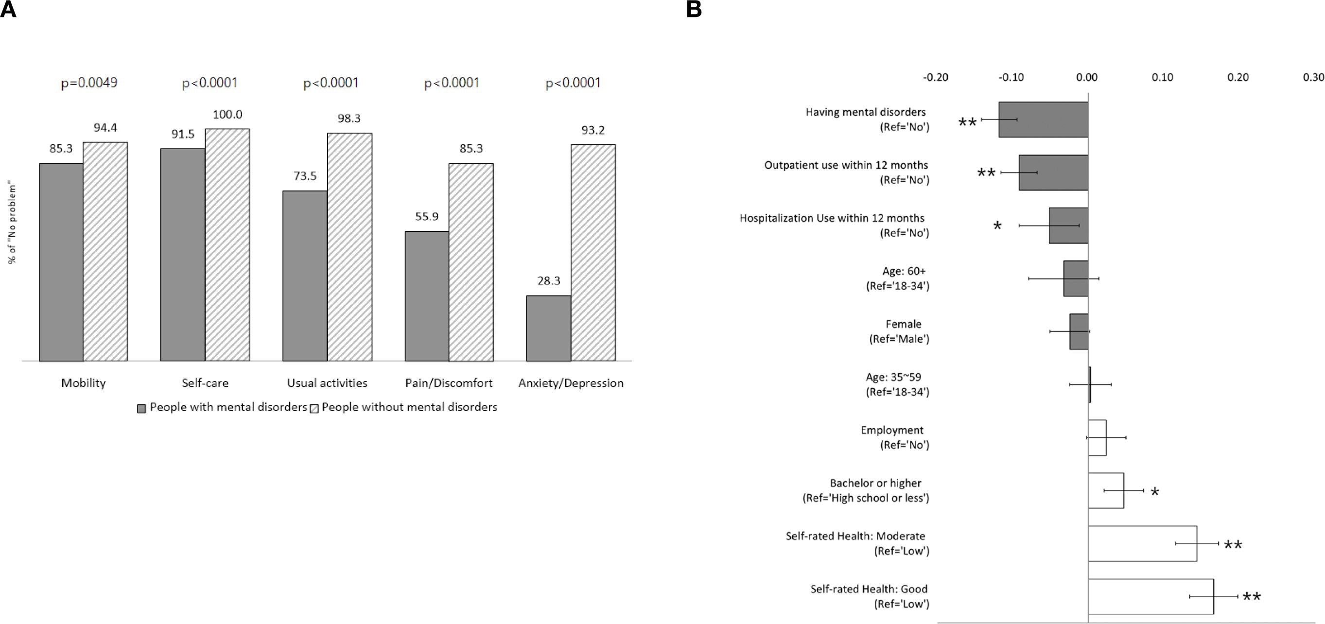 Panel A is a bar chart comparing people with and without mental disorders across five categories: mobility, self-care, usual activities, pain/discomfort, andanxiety/depression. People without mental disorders report higher percentages of “no problem” in all categories. Panel B is a horizontal bar chart showing the mean differences in EQ-5D scores across variables with categories like having mental disorders, healthcare use within twelve months, age, gender, employment, education, and self-rated health, indicating significant differences with asterisks.