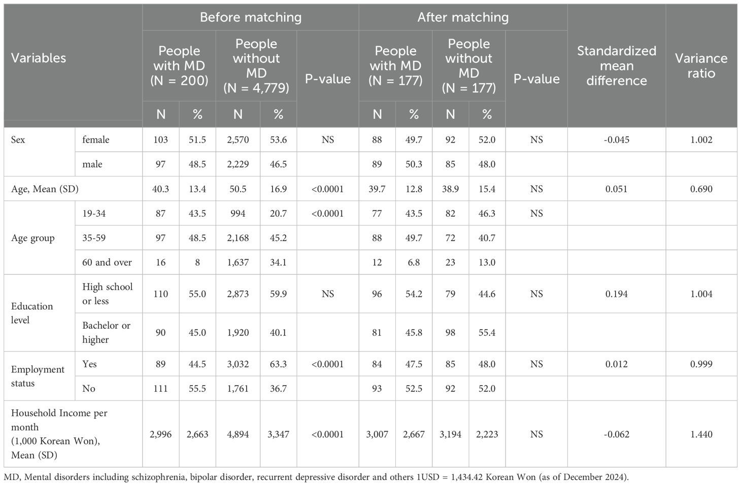 A total of 354 people were matched: of them, 177 had a mental disorder and 177 did not. Among the group with mental disorders, the proportion of men and women was equal, with an average age of 39.7 (SD 12.5). Of this group, 45.8% had a college degree or higher and 47.5% were in employment with an average monthly income of 3,007 (SD 2,667) thousand Korean won (KRW). In the group without mental disorders, 52% were male, with an average age of 38.9 (SD 15.4). 55.4% of this group had a college degree or higher and 48.0% were employed, earning an average monthly income of 3,194 (SD 2,223) thousand KRW. However, there were no statistical differences between the two groups in terms of any of the variables, as the two groups were matched by their socio-demographic characteristics. The matching was balanced because the SMDs for these variables were less than 0.25 and their VRs were close to 1.