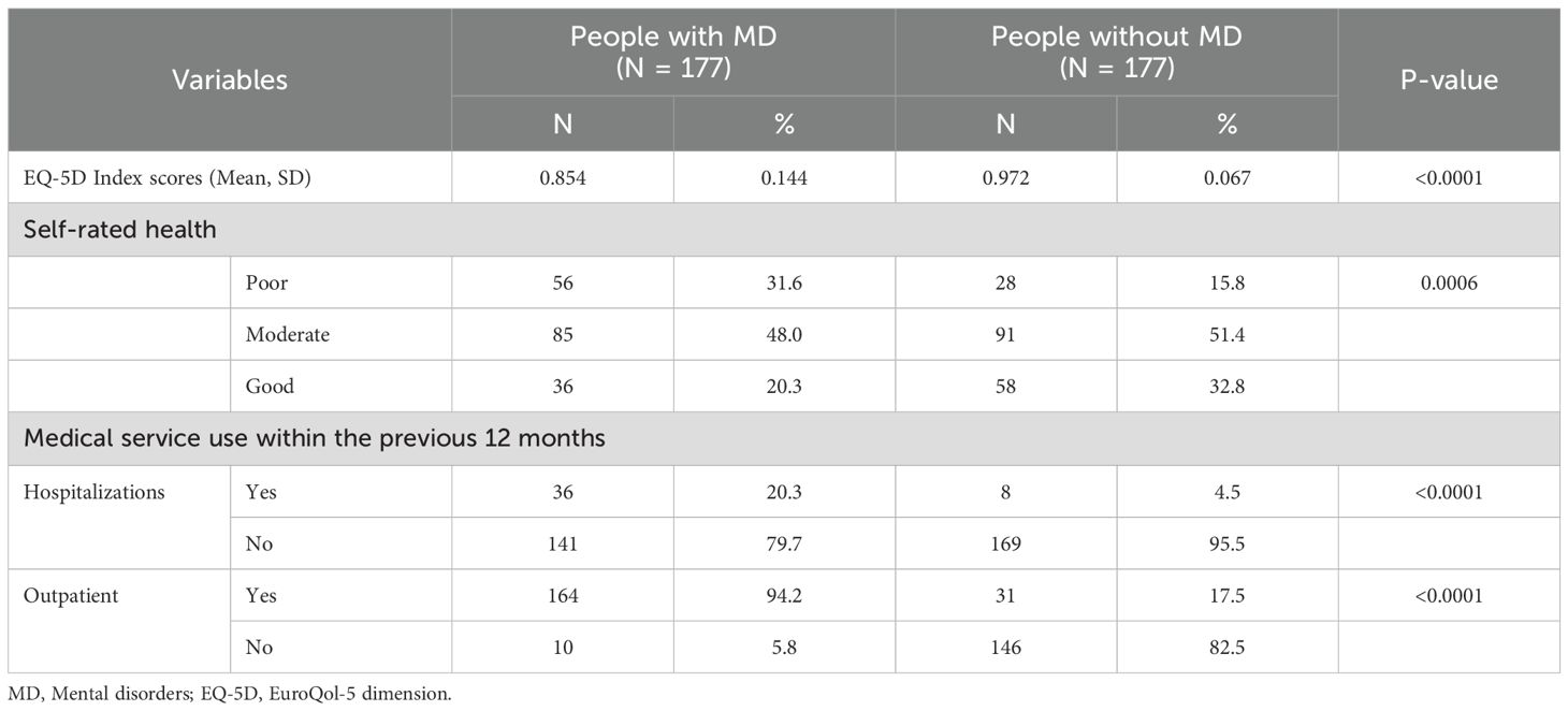 Table 2 illustrates the approximate differences in health status between the two groups, including EQ-5D scores, self-rated health, and inpatient or outpatient service use within the past 12 months. People with mental disorders had significantly lower EQ-5D index scores (0.854, SD 0.144 vs. 0.972 SD 0.067, p<0.0001), a higher rate of “poor” health (31.6% vs. 15.8%, p=0.0006), a higher rate of hospitalizations (20.3% vs. 4.5%, p<0.0001) and a significantly higher rate of outpatient service use in the past 12 months (94.3% vs. 17.5%, p<0.0001) than the control group.