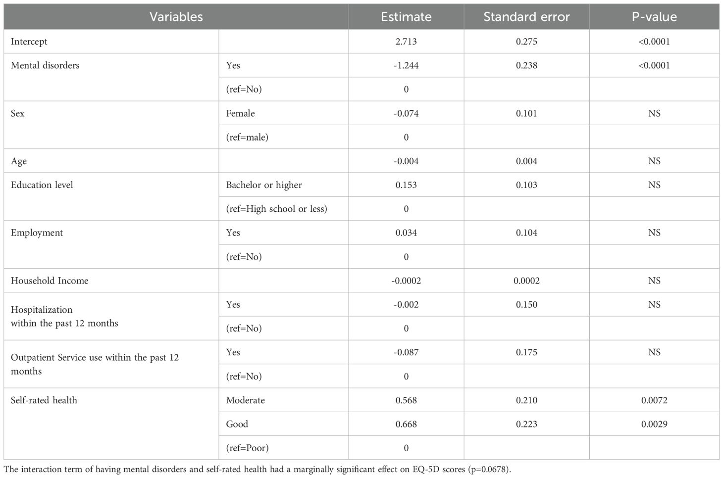 The results showed that individuals with mental disorders had significantly lower EQ-5D scores compared to those without mental disorders (0.854 SD 0.144 vs. 0.972 SD 0.067, p<0.0001). Specifically, the beta regression analysis revealed that individuals with mental disorders had 71.2% lower HRQoL than those without. This finding aligns with previous research (1820). For instance, a Swedish study found that individuals with mental disorders had substantially lower HRQoL compared to the general population (EQ-5D scores 0.727 vs. 0.812) (19). Similarly, a Finnish study found that individuals with schizophrenia had significantly lower EQ-5D scores (0.715, SD 0.041) than those without psychosis (0.838, SD 0.003) (20). Other measure such as SF-6 (Short Form 6 Health Survey), SF-12, and WHOQOL-BREF (World Health Organization Quality of Life-Brief Version) have also been used to measure HRQoL among people with mental disorders, and similar results have been reported (18, 21, 42, 43). For example, a French study using the SF-6 showed significantly lower HRQOL scores among individuals with mental disorders than the general population (0.683, SD 0.121 vs. 0.766, SD 0.137) (21). This is crucially employed in health economics to estimate the quality-adjusted life years(QALY) of mental disorders.
