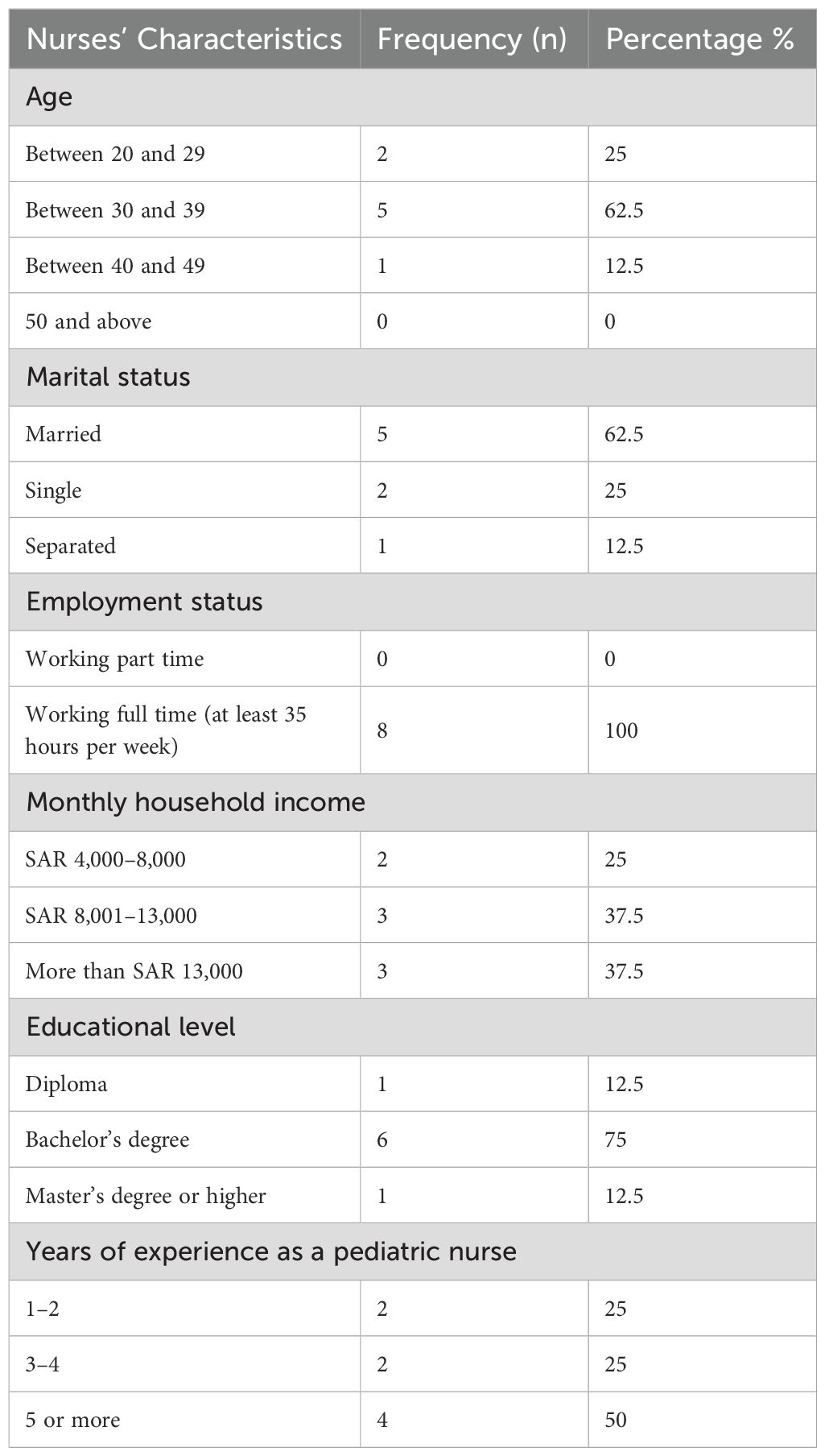 A total of eight female nurses were interviewed and included in this study. The sample included full-time nurses from different age groups. The majority of nurses were aged between 30 and 39 years old and married (n=5, 62.5%), had a bachelor’s degree (n=6, 75%), and had at least 5 years of experience (n=4, 50%). Detailed demographics characteristics are presented in Table 1.