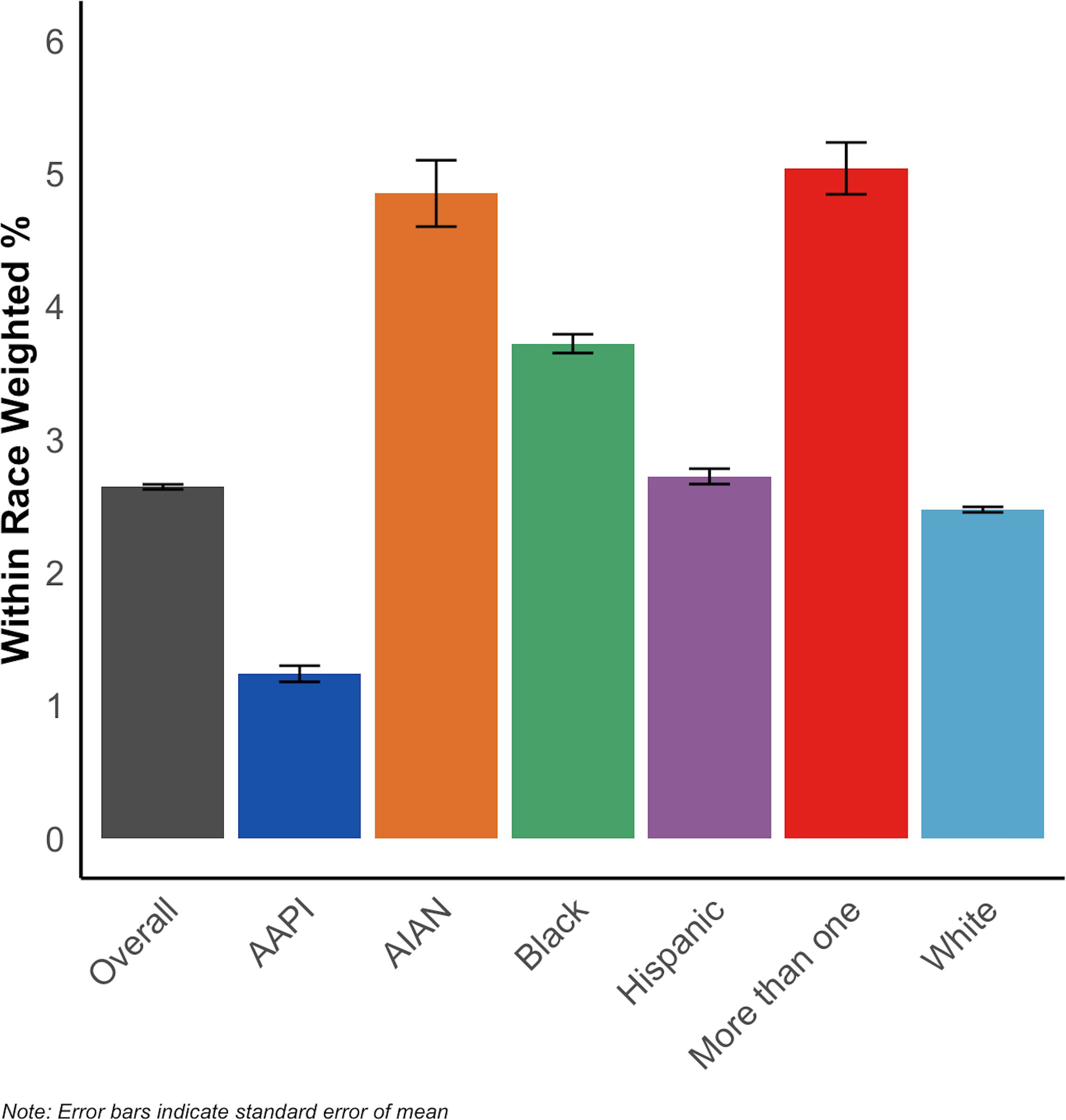 Bar Chart showing within race weighted percentages of Cannabis Use Disorder. Categories include Overall, AAPI, AIAN, Black, Hispanic, More than one, and White. Each bar is color-coded, with error bars indicating the standard error of the mean.