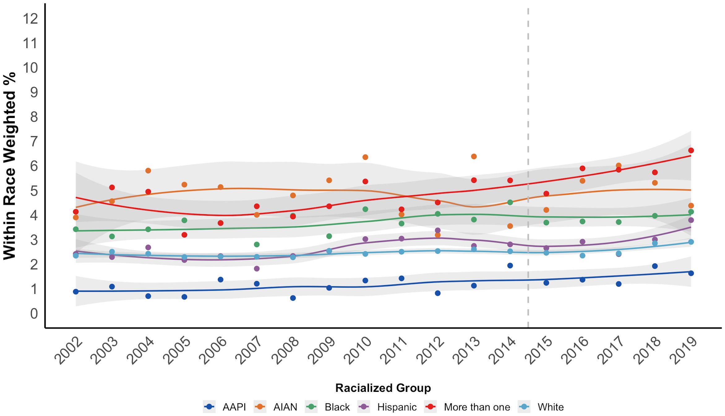 Line chart showing within race weighted percentages of CUD from 2002 to 2019 for different racialized groups. Percentages range from 0 to 12 on the y-axis. Colored lines indicate trends for AAPI, AIAN, Black, Hispanic, and more than one race, with variations over years. A grey shaded area represents confidence intervals. A dotted vertical line marks the year 2015.