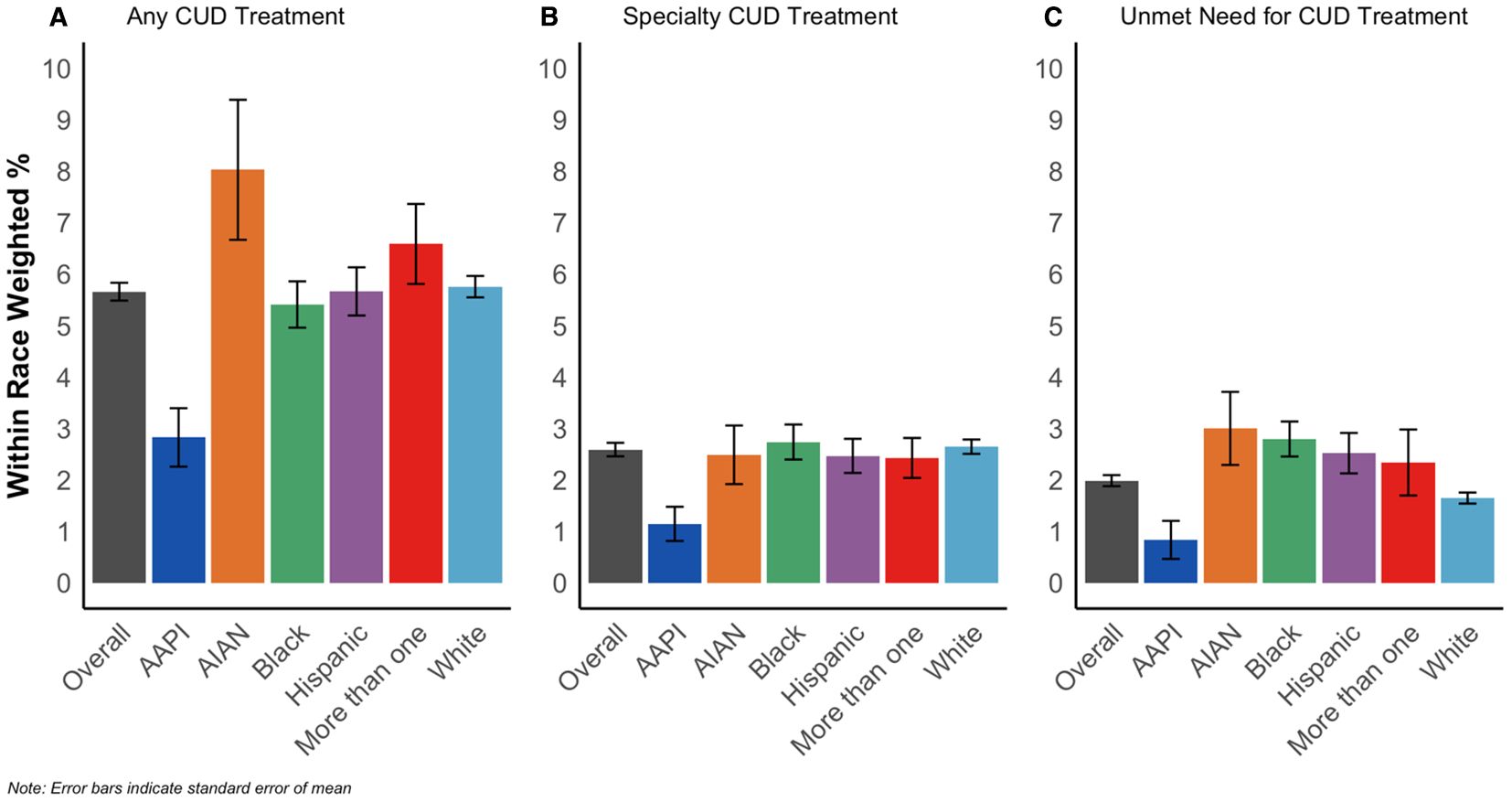 Bar charts depict three panels: A) Any CUD Treatment shows varied treatment percentages across racial groups, with American Indian/Alaska Native highest. B) Specialty CUD Treatment displays lower percentages overall, with similar racial distribution. C) Unmet Need for CUD Treatment indicates unmet needs, with American Indian/Alaska Native showing the most. Error bars represent standard error of the mean.
