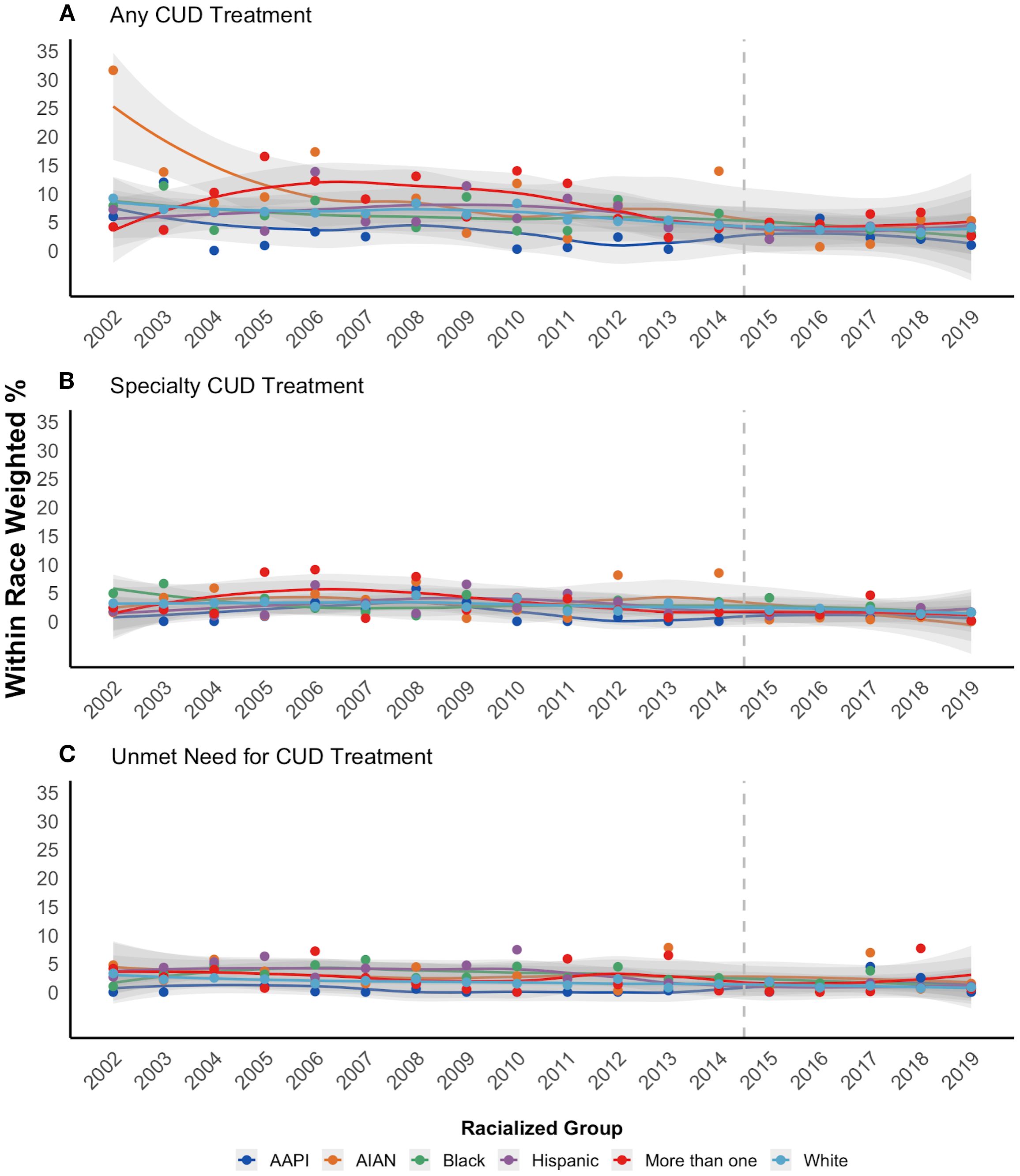 Line graph illustrating trends in CUD treatment from 2002 to 2019 for different racialized groups. Panel A shows percentages for any CUD treatment, Panel B for specialty CUD treatment, and Panel C for unmet needs. Data points are color-coded by racial group, with a noticeable decrease in any CUD treatment over time. Each graph includes shaded areas indicating variability, and a dashed line marks 2015.