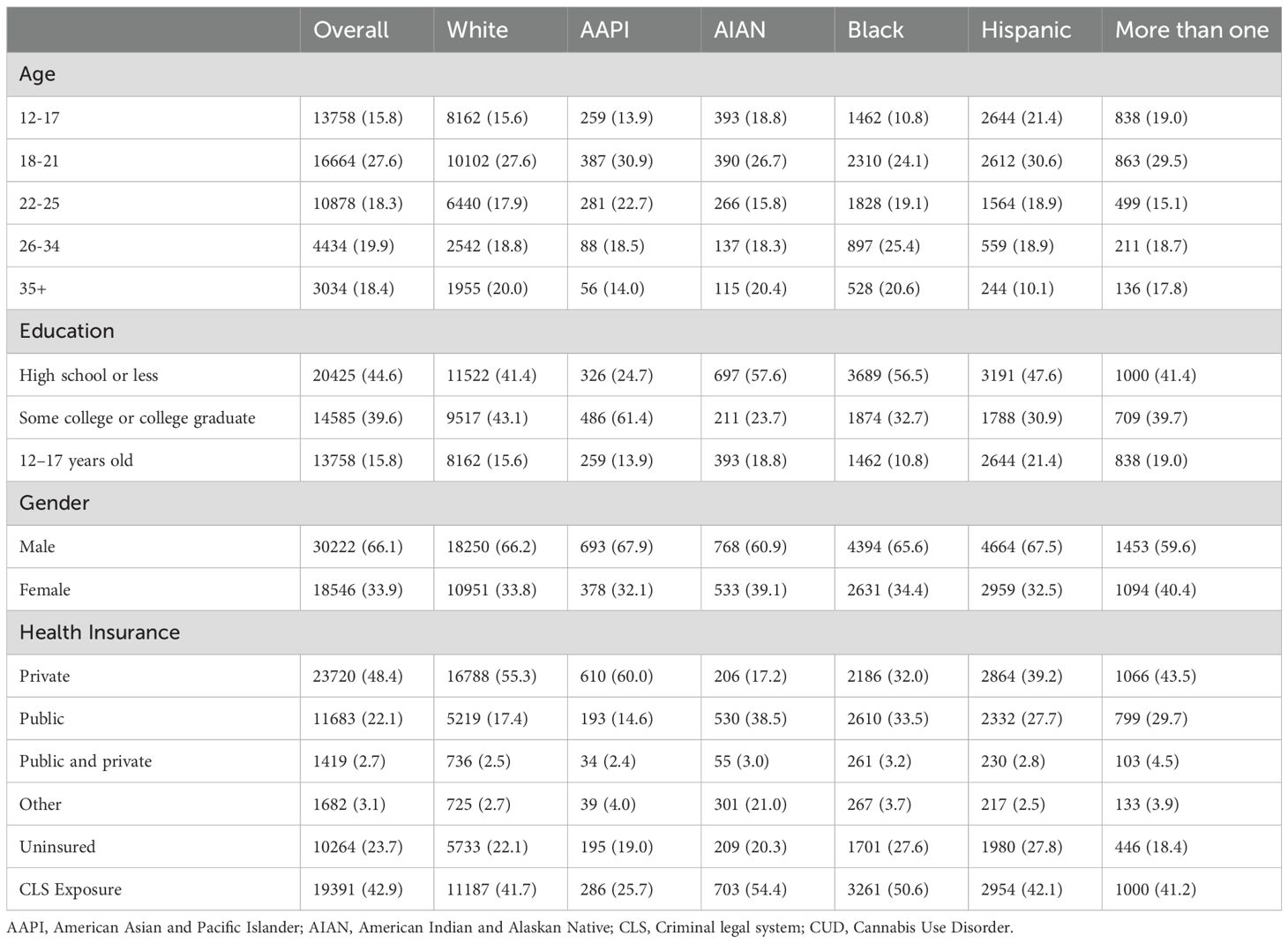 Table 1 explores weighted summary statistics of those meeting criteria for DSM-5 proxy CUD in NSDUH 2002-2019 (N = 48,768). Our weighted sample was 61.8% white, 2.4% AAPI, 1.0% AIAN, 16.7% Black, 15.4% Hispanic, and 2.8% more than one racialized group. The sample was 66.1% male, 27.6% were between the ages 18-21, 44.6% had up to a high school degree, 48.4% had private health insurance, and 43.0% had any lifetime CLS involvement.