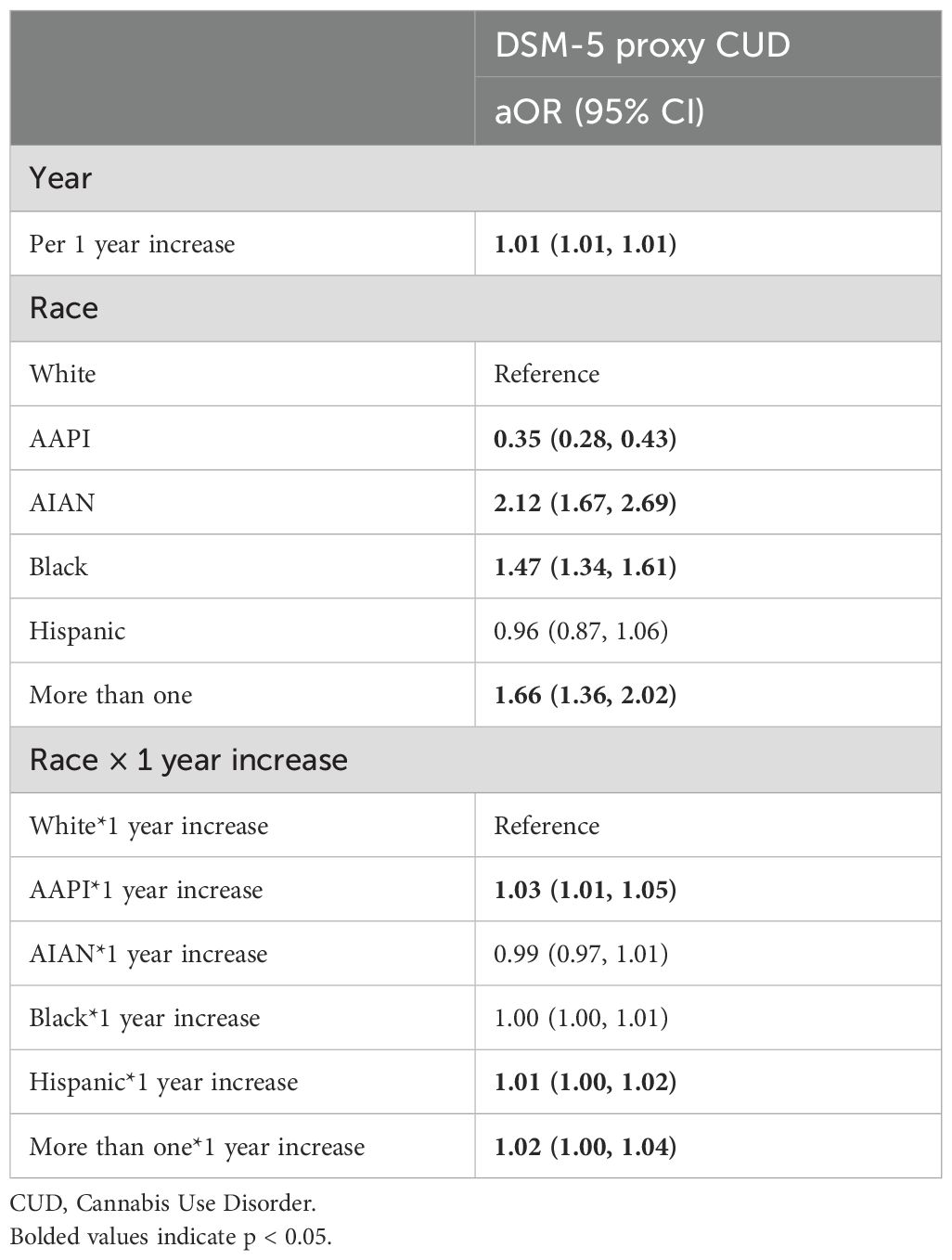 To assess trends in CUD over time we ran weighted, unadjusted logistic models regressing DSM-5 proxy CUD on the continuous year variable. To see if trends varied by racialized group we added an interaction term between race and continuous year.