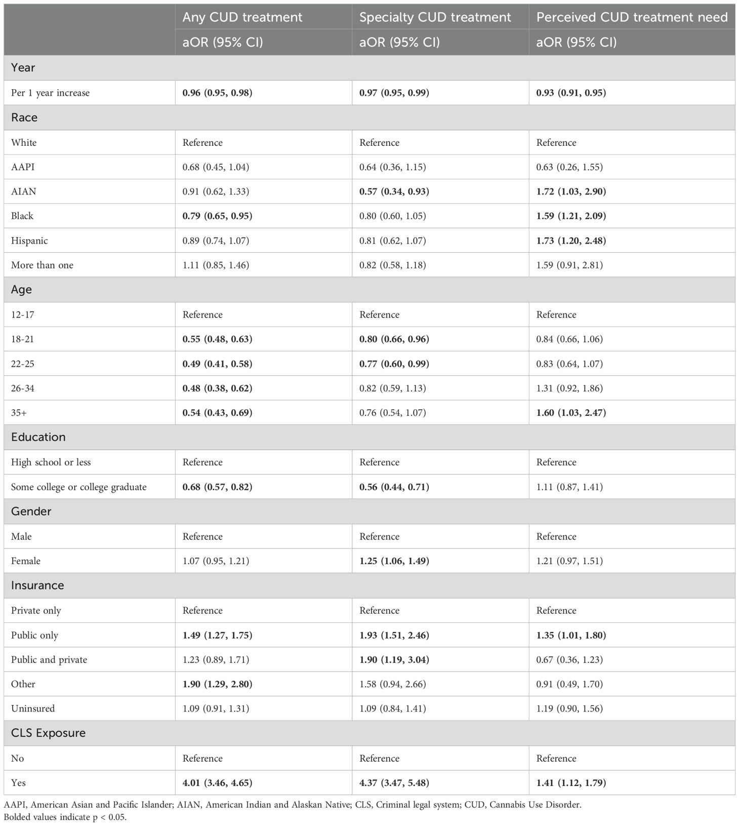 Table 3 displays weighted logistic model results regressing our three outcomes on racialized group accounting for continuous year, age group, education, binary gender, health insurance status, and lifetime CLS exposure. The adjusted odds of any CUD treatment were significantly lower among Black people compared to white people (aOR = 0.79, 95% CI = 0.65, 0.95), but not for other racialized groups. AIAN people had significantly lower odds of specialty CUD treatment compared to white people (aOR = 0.57, 95% CI = 0.34, 0.93), but this relationship was not significant for other racialized groups. Black (aOR = 1.59, 95% CI = 1.21, 2.09), Hispanic (aOR = 1.73, 95% CI = 1.20, 2.49), and AIAN (aOR = 1.72, 95% CI = 1.03, 2.90) people all had higher odds of perceived treatment need compared to white participants. The odds of any CUD treatment (aOR = 4.01, 95% CI = 3.46, 4.65), specialty CUD treatment (aOR = 4.37, 95% CI = 3.47, 5.48), and perceived need for CUD treatment (aOR = 1.41, 95% CI = 1.12, 1.79) were all higher for those with lifetime CLS exposure compared to those without.
