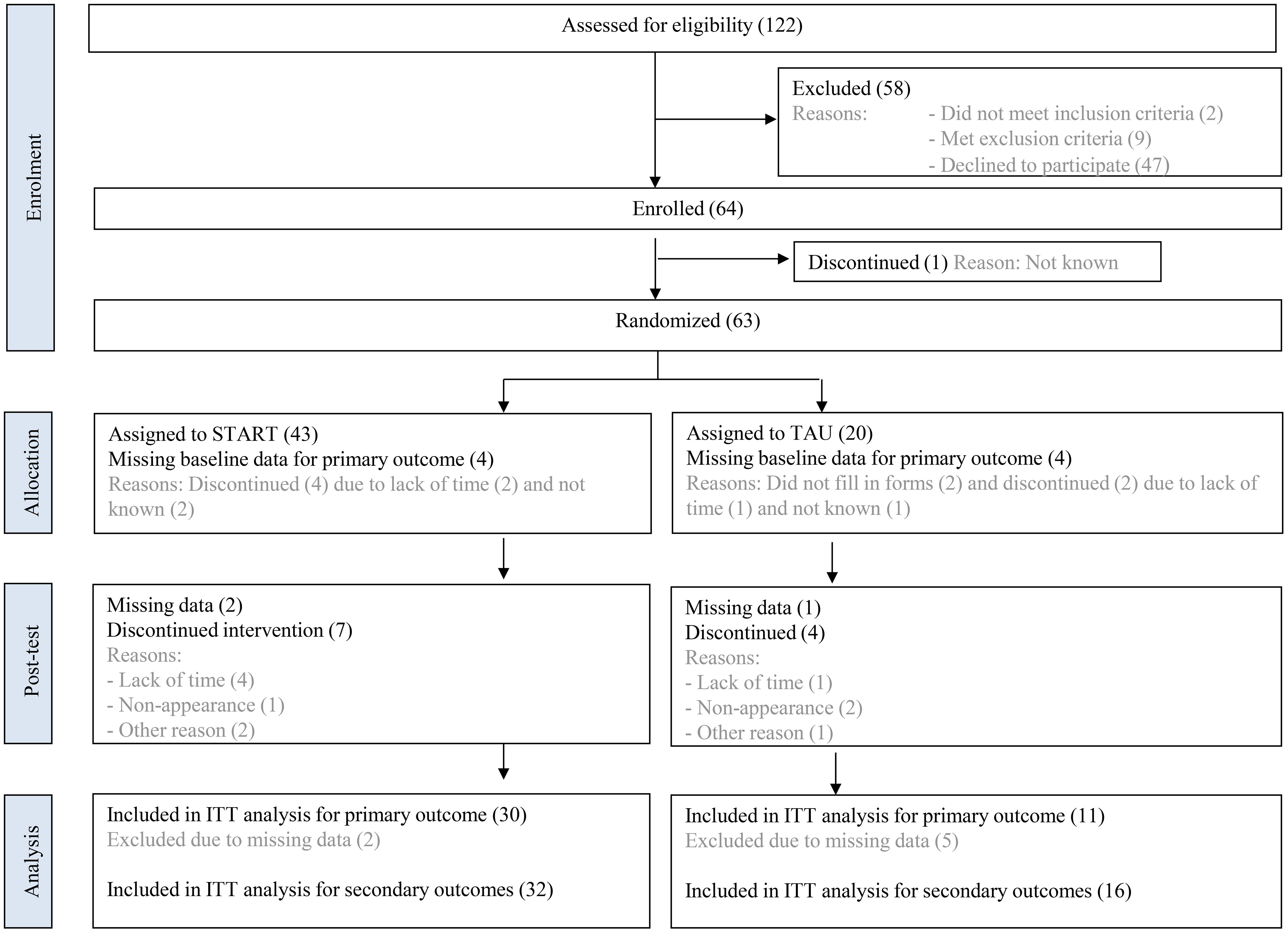 One hundred twenty-two individuals were screened for eligibility. Out of these, 47 declined to participate and 12 were ineligible due to; did not meet inclusion criteria (n = 2), met exclusion criteria (n = 9) and did not show up (n = 1). Sixty-three participants were found eligible and were randomly assigned to the START intervention (n = 43) or treatment as usual (TAU) (n = 20). Participant enrolment and a flow chart based on primary outcome is presented in Figure 1. Twenty-two participants had missing data at the 12-week assessment due to loss to follow-up (n = 11) or withdrawal (n = 11) (13 in the intervention and 9 in the control group). As a result, complete data for primary outcome was available for 41 participants (65%), while data for any secondary outcome was available for 48 participants (76%) (Figure 1).