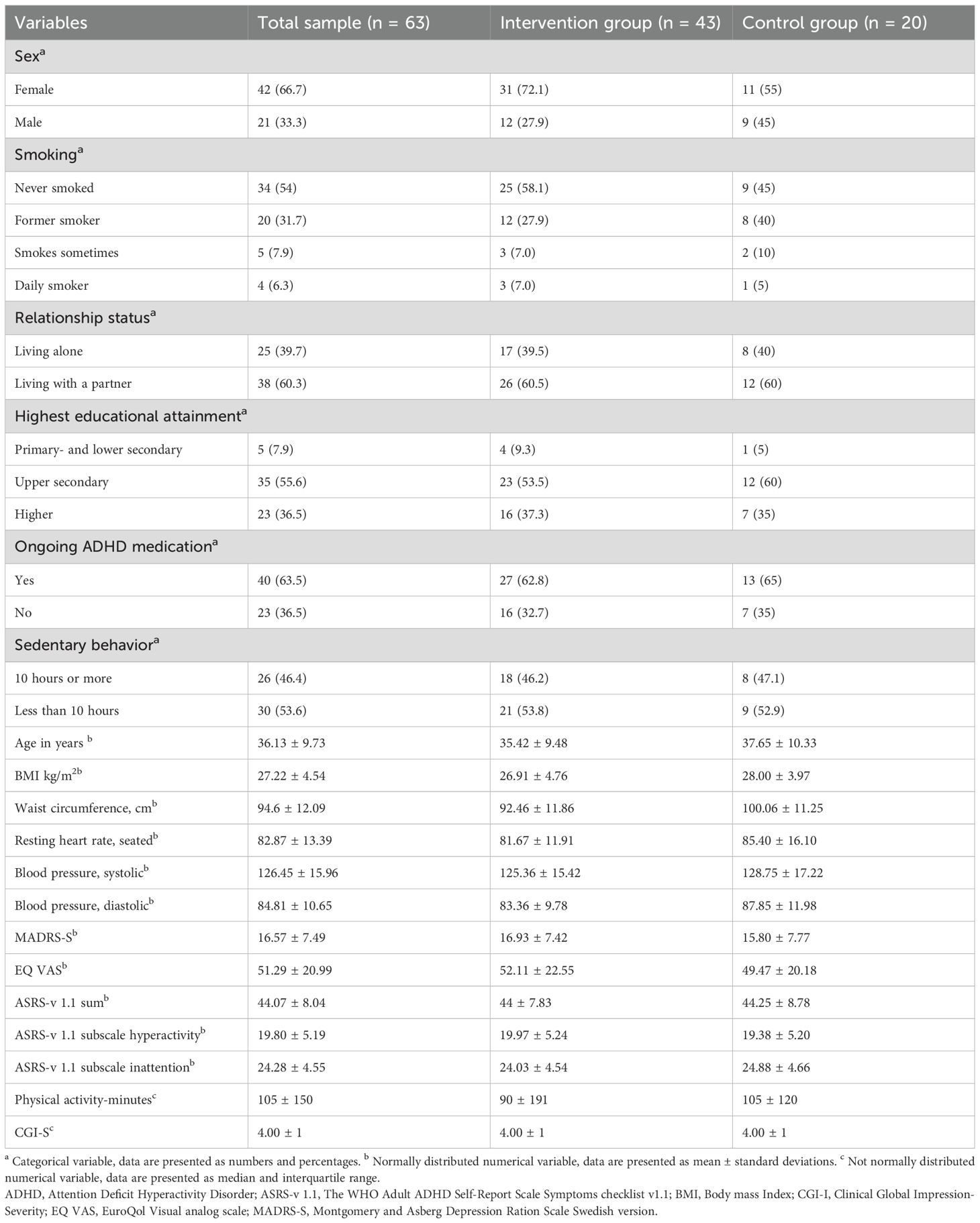 Table 1 presents baseline data and clinical characteristics for the intervention group, control group and for the total sample. Forty-two females and 21 men were included in the study with mean age of 36.1 years (SD 9.7), a mean baseline ASRS-v1.1 score of 44.07 and mean CGI-S score of 4. About 2/3 of the participants (63%) had ongoing ADHD medication and about half of the participants (46.4%) reported sedentary behavior of 10 hours or more per day.