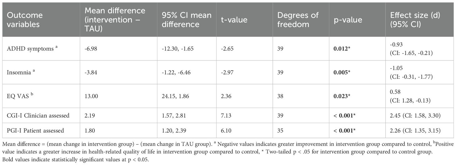 The primary outcome, ADHD symptoms measured with ASRS-v1.1, differed significantly between intervention and control group at post-intervention (Mean difference: -6.98, 95% CI: -12.30, -1.65, p = 0.012), favoring the intervention group, with a large effect size (Cohen´s d: 0.93). The mean ASRS score decreased by -7.07 (SD: 7.99) points from baseline to 12 weeks in the intervention group and decreased by -0.09 (SD: 5.71) points in the control group (Table 2).