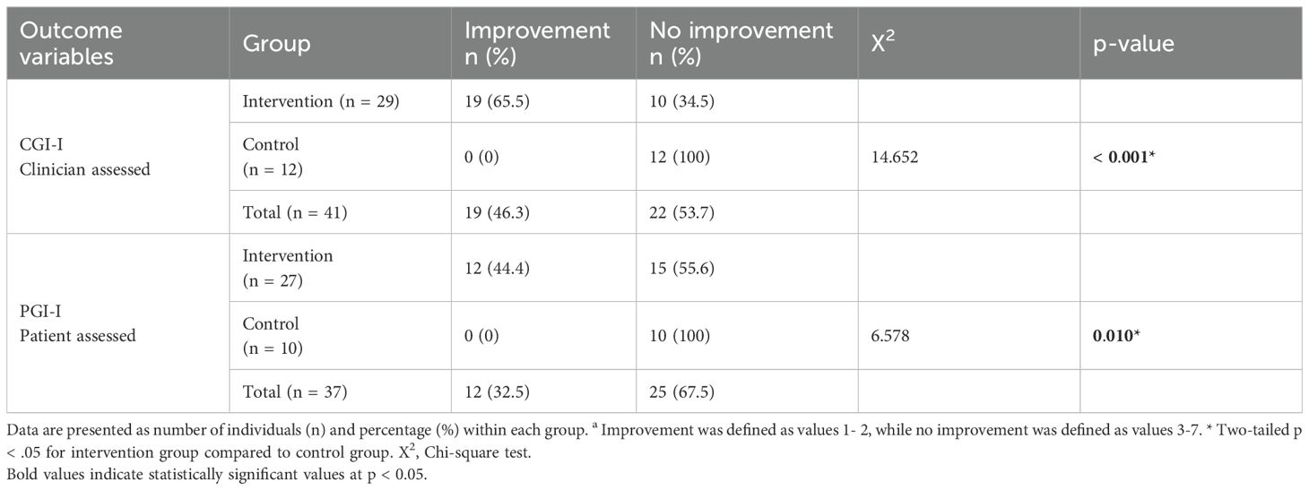 Nineteen participants (65.5%) in the intervention group were classified as having a clinically meaningful improvement based on CGI-I, compared to none in the control group (X2 = 14.652, p< 0.001) with a large effect size (Phi = 0.60). Similarly, on the PGI-I, 12 participants (44.4%) in the intervention group reported a clinically meaningful improvement, whereas none in the control group reported a clinically meaningful improvement (X2 = 6.578, p = 0.010) The effect size was medium (Phi = 0.42)(Table 3).